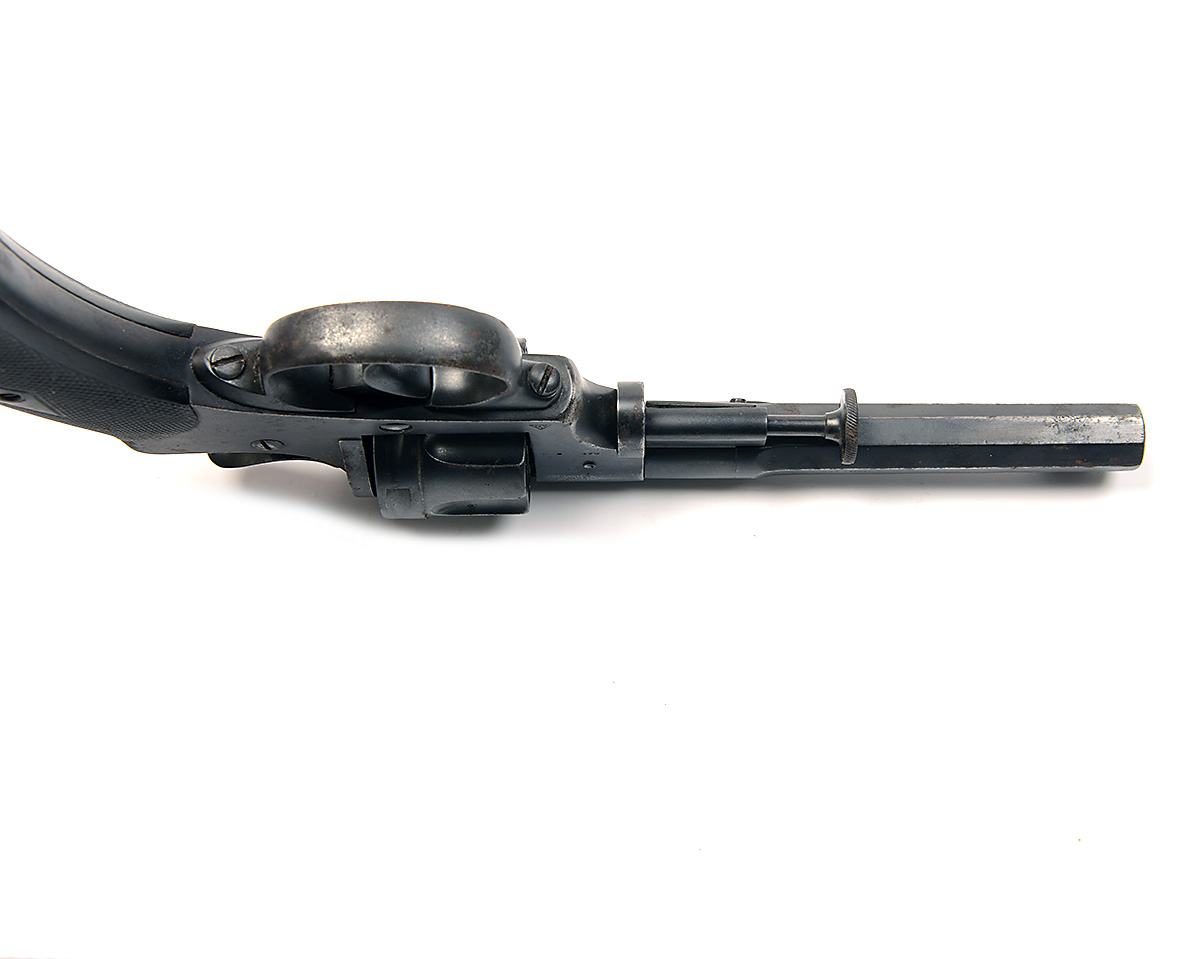 Belgian proved circa 1875, with 5 1/2in. octagonal barrel marked 'ACIER FONDU', crescent fore-sight, rounded breech with swing-out ejector, fluted slightly stepped cylinder, solid frame (not field strippable), double action mechanism with spurred hammer, finely chequered dark wood grips and lanyard ring at heel, some staining and small areas of light pitting over original finish