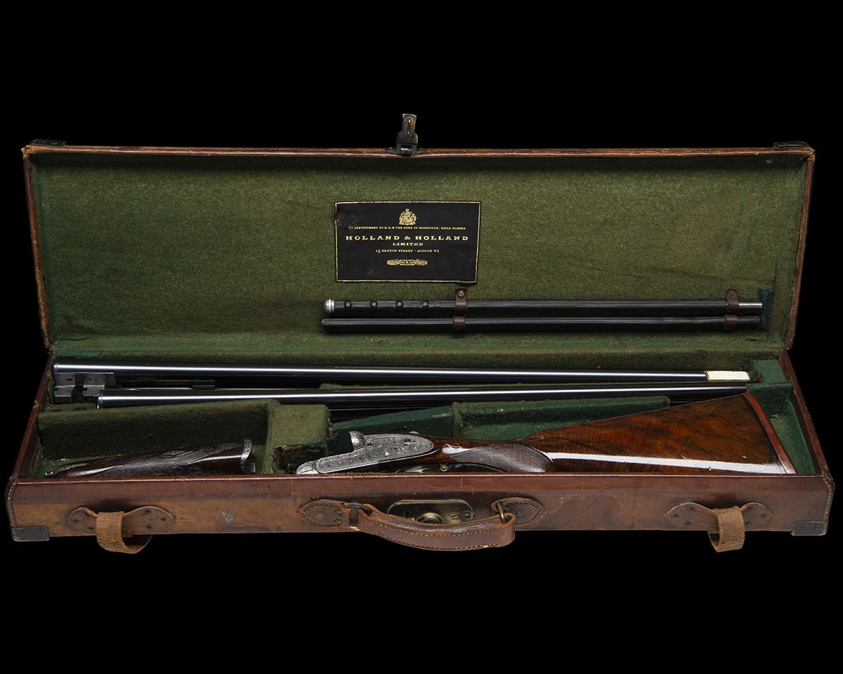 extra 28in. nitro barrels (by the makers in 1976), the rib gold-inlaid '2 and the tubes engraved 'HOLLAND & HOLLAND. 13. BRUTON STREET. LONDON.', 2 3/4in. chambers, bored approx. 1/2 choke in both, toplever gold-inlaid '2', automatic safety with gold-inlaid 'SAFE' detail, gold-inlaid cocking-indicators, semi-selective single trigger, best 'Royal' scroll engraving, brushed bright and some pins blued, 14 1/4in. semi-pistolgrip stock (slight crack at hand) including 1/2in. rubber recoil pad, weight 6lb. 10oz (6lb. 12oz. with extra barrels), in a leather case with provision for both sets of barrels