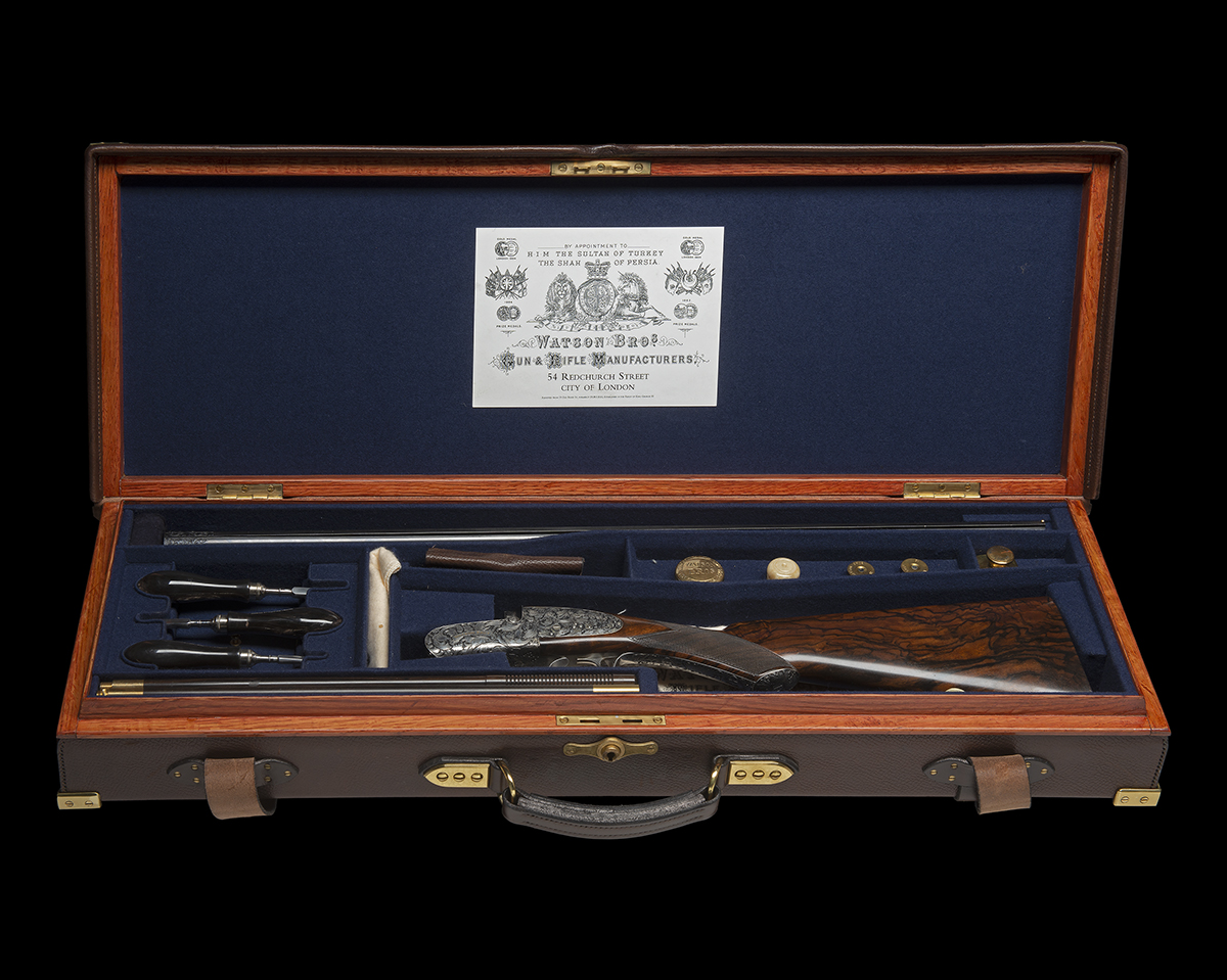 29in. nitro barrels with 5mm raised matt top-rib and side-ribs, scroll-engraved at the breech end and over barrel with 'WATSON BROS. 39 REDCROSS WAY. LONDON BRIDGE.', 2 3/4in. chambers, bored approx. 1/2 choke in both, hold-open toplever pierced with a pheasant, non-selective single trigger, rolled-edge triggerguard, automatic safety, cocking-indicators, action, lockplates and furniture deeply carved with bold acanthus on a matt background and gold-inlaid with the makers name, the fences carved with pheasant heads and the underside carved with a vignette of a cock pheasant in flight, the triggerguard finely pierced with a further two cock pheasants, 14 1/2in. exhibition grade Prince of Wales grip stock with engraved pistolgrip-cap, weight 6lb. 9oz., in its makers brass-cornered oak and leather case with some accessories