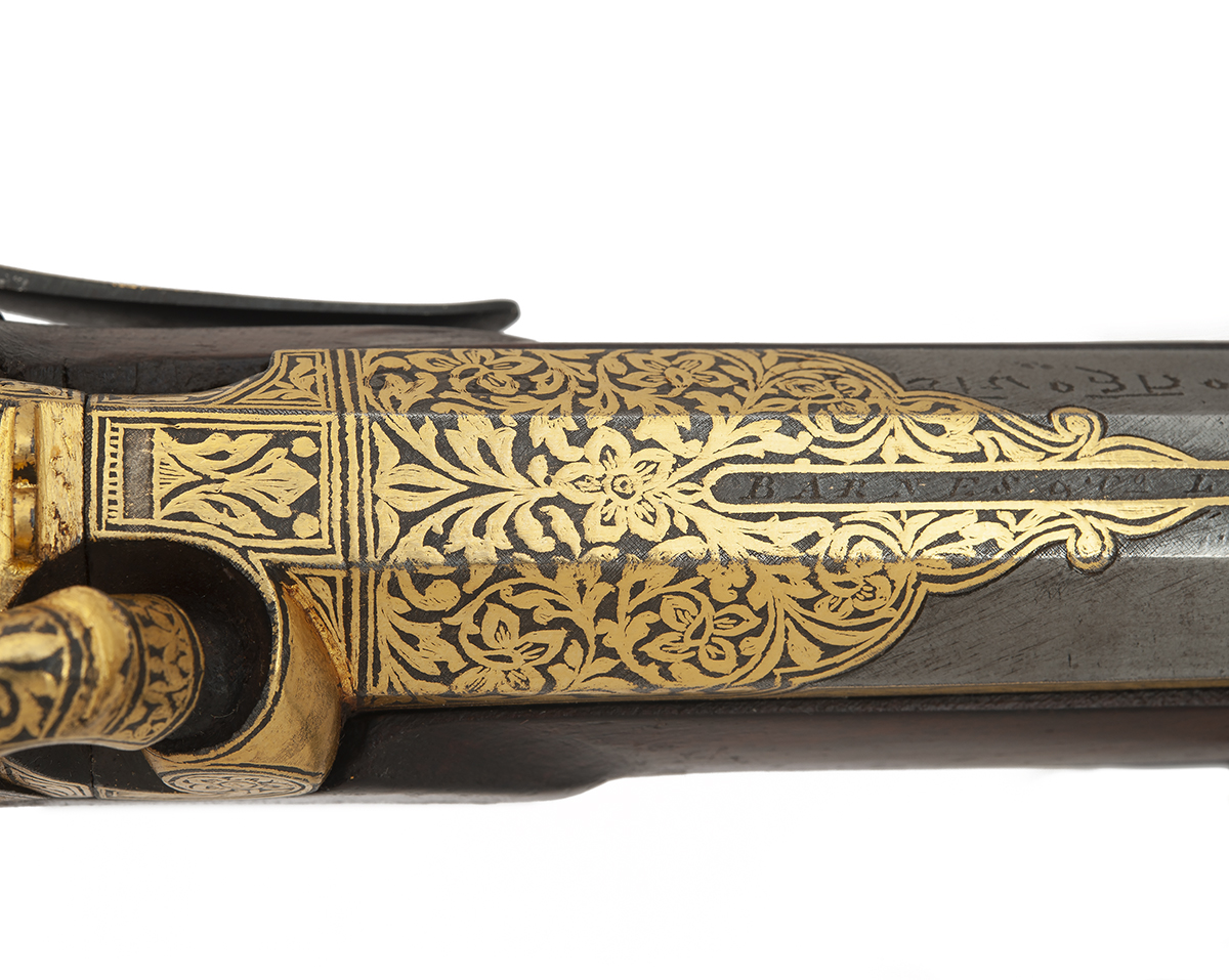 for the Indian market circa 1850, with smoothbore octagonal 7 3/4in. barrel profusely decorated with gold koftgari arabesques forming panels at muzzle and breech, each panel joined by full-length koftgari decoration along the side-flats, the top-flat with a stylised spear, all on a bright background, bead fore-sight, the breech-end signed 'BARNES & CO, LONDON' and bordered by a gold line, farsi inscription to the left top-flat, the breech-block, snail and top-tang full gold damascened and with standing notch rear-sight, fully gold damascened slightly curved back-action lock signed in a panel 'BARNES & CO', en-suite hammer, walnut full-stock with chequered bag-shaped butt, fully gold damascened trigger guard bow, lower tang, belt-hook , trigger blade and ramrod throat and pan-headed iron captive ramrod with gold damascened stirrup and head