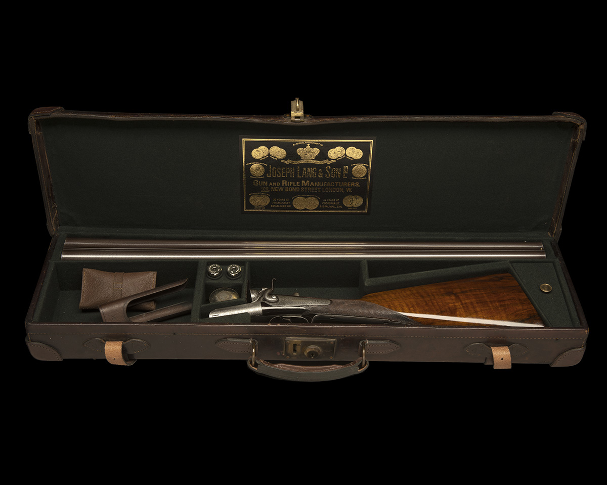 30in. black powder only fine damascus barrels, the rib engraved 'JOSEPH LANG & SON. 22 COCKSPUR STREET. PALL MALL. LONDON.', (rubbed), 2 1/2in. chambers, bored approx. imp. cyl. and true cyl. choke, some internal pitting, carved percussion fences finely engraved with grape and vine motifs, slender toplever, rebounding back-action locks, fine acanthus scroll engraving with floral bouquets, brushed finish overall, 14 1/4in. figured stock (minor setting cracks to rear of top tang), weight 6lb. 8oz., in a leather case with some accessories
