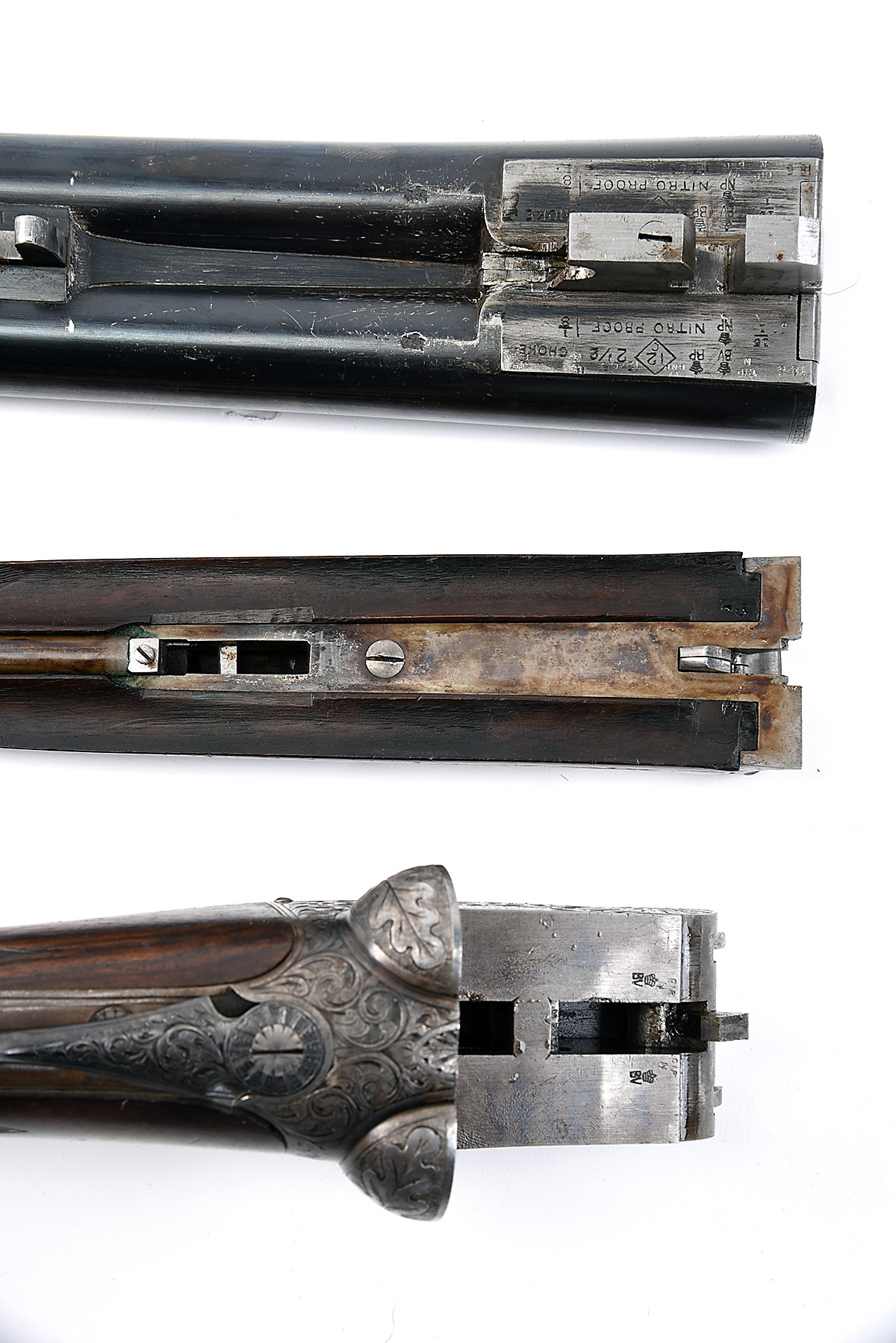 J. GRAHAM & CO. (INVERNESS) 12-BORE BOXLOCK EJECTOR, serial no. 6185, serial number on barrel loop only, circa 1930, 28 1/4in. nitro reproved (in 2021) barrels (struck off), the rib engraved 'J. GRAHAM & CO. 27 UNION STREET. INVERNESS. and with acanthus scroll detailing at the breech-end, 2 1/2in. chambers, bored approx. 3/4 choke in both, automatic safety with engraved 'SAFE' detail, bold acanthus scroll engraving retaining traces of colour-hardening and finish, 14 3/4in. figured stock including 5/8in. ebonite extension, weight 6lb. 5oz.