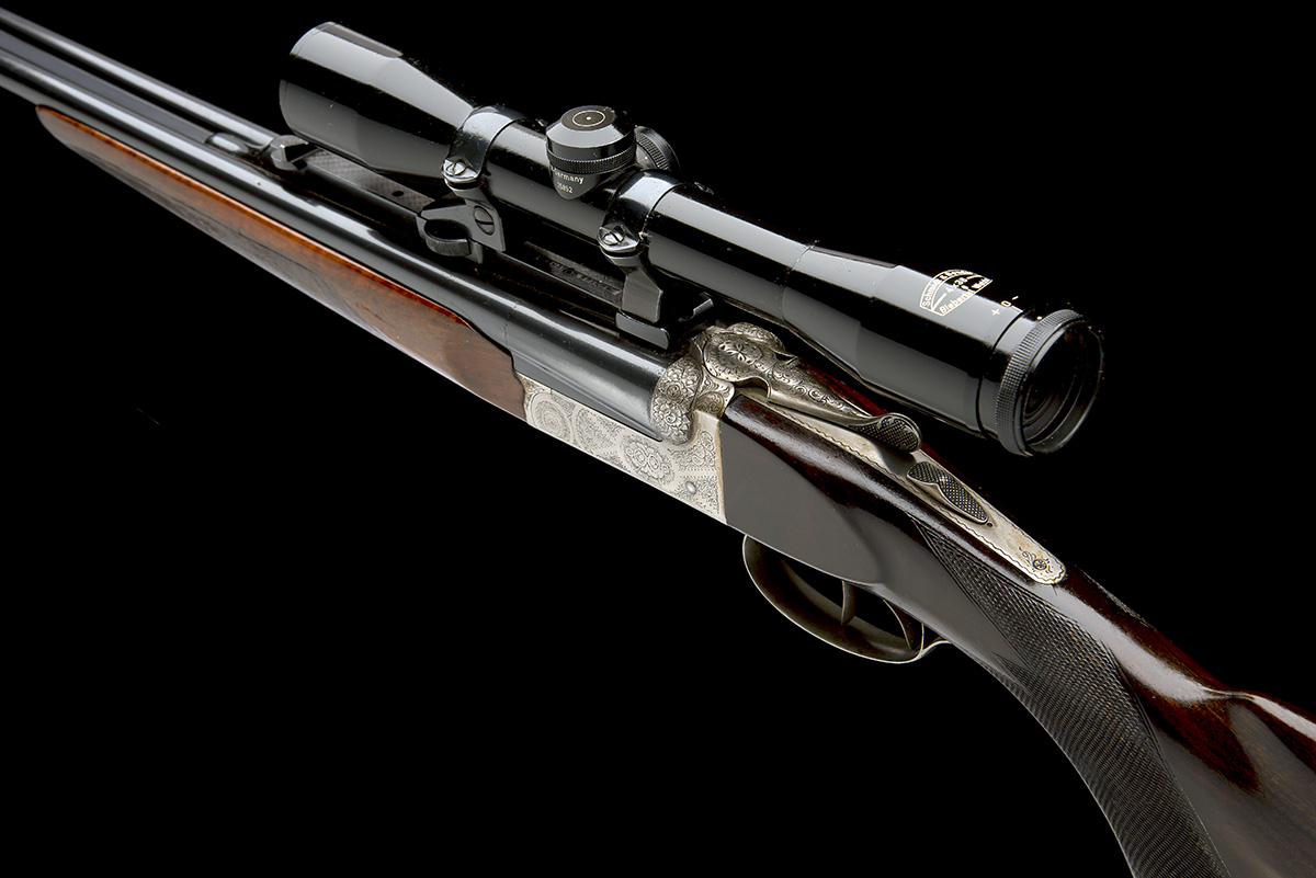 hold-open toplever, removable striker discs, manual safety, floral and scroll engraving, bright finish, 14 1/2in. pistolgrip stock with palm swell and cheekpiece, steel pistolgrip-cap (with trap), sling eyes, weight 8lb. (rifle barrels, unscoped), 9lb. 3oz. (rifle barrels, with scope) and 6lb. 7oz. (shot barrels), in its canvas case