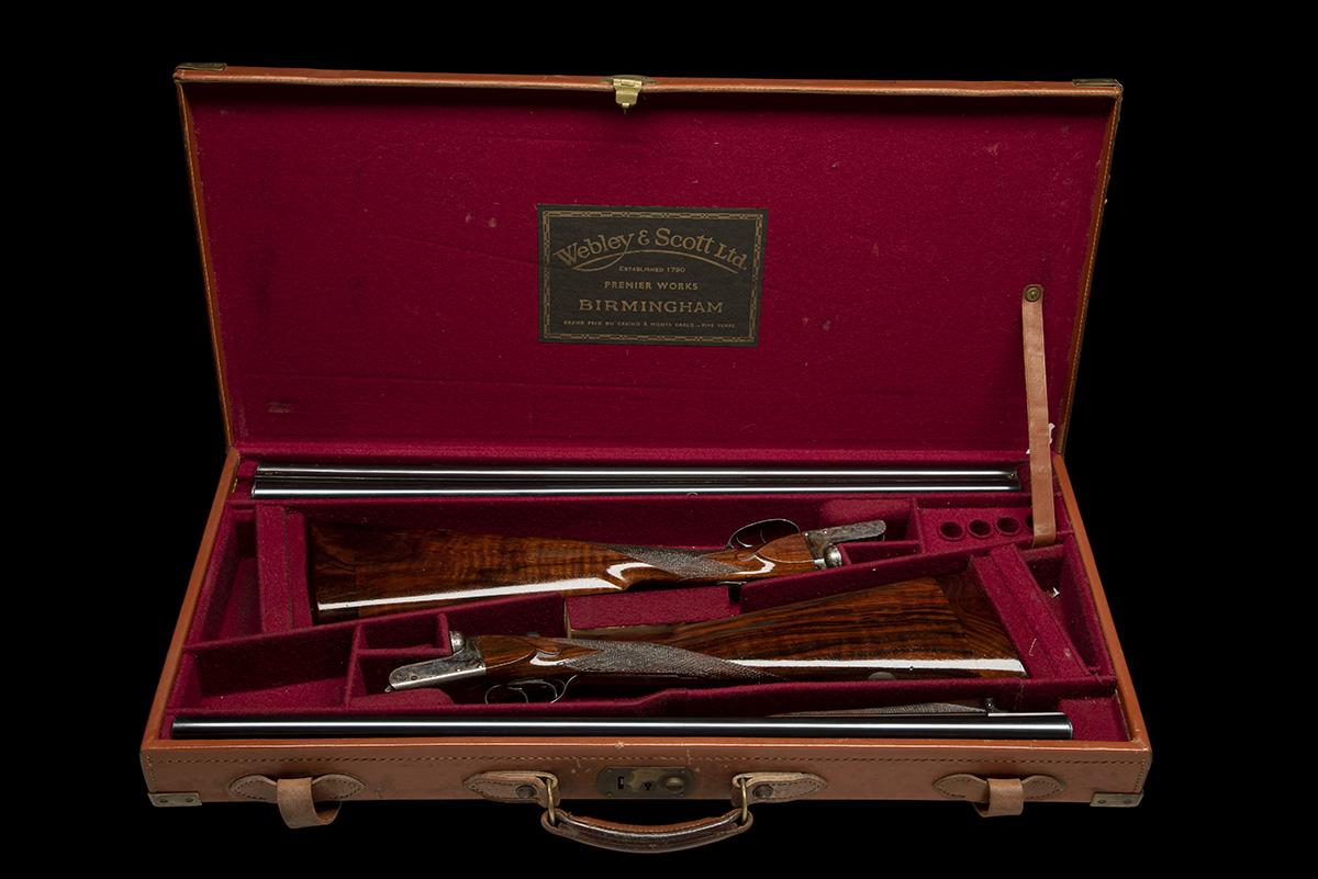 for 1971, 27in. nitro barrels, the ribs gold-inlaid '1' and '2' at the breech ends, 2 3/4in. chambers, bored approx. 1/4 and true cyl. (No.1) and true cyl. and 1/4 choke (No.2), toplevers gold-inlaid '1' and '2', automatic safeties, border and acanthus scroll engraving, retaining some original colour-hardening and finish, 15 5/8in. figured stocks, cast on for the left shoulder and including 1 3/8in. wooden extensions, No.2 fore-end missing steel finial, weight 6lb. 2oz., in their brass-cornered leather case