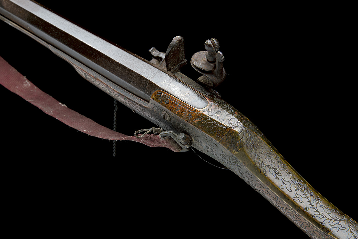 Mediterranean, possibly Greek circa 1800, with two-stage 27 1/2in. barrel of Spanish form, carved girdle at the intersection, bead fore-sight, no provision for rear-sight, solid top-tang, borderline engraved slightly radiused lock with carved and moulded mask at tail, carved cover to the frizzen-spring (lockwork currently frozen), the full-stock completely covered in florally engraved white metal, fish-tailed crescent butt, carved iron trigger-guard, side mounted swivels and iron ramrod, the whole heavily stained and with surface corrosion to iron parts and fitted with a woven sling (missing possibly three sheet-metal barrel-bands), overall length 43 1/2in., weight approximately 6 1/2lbs.