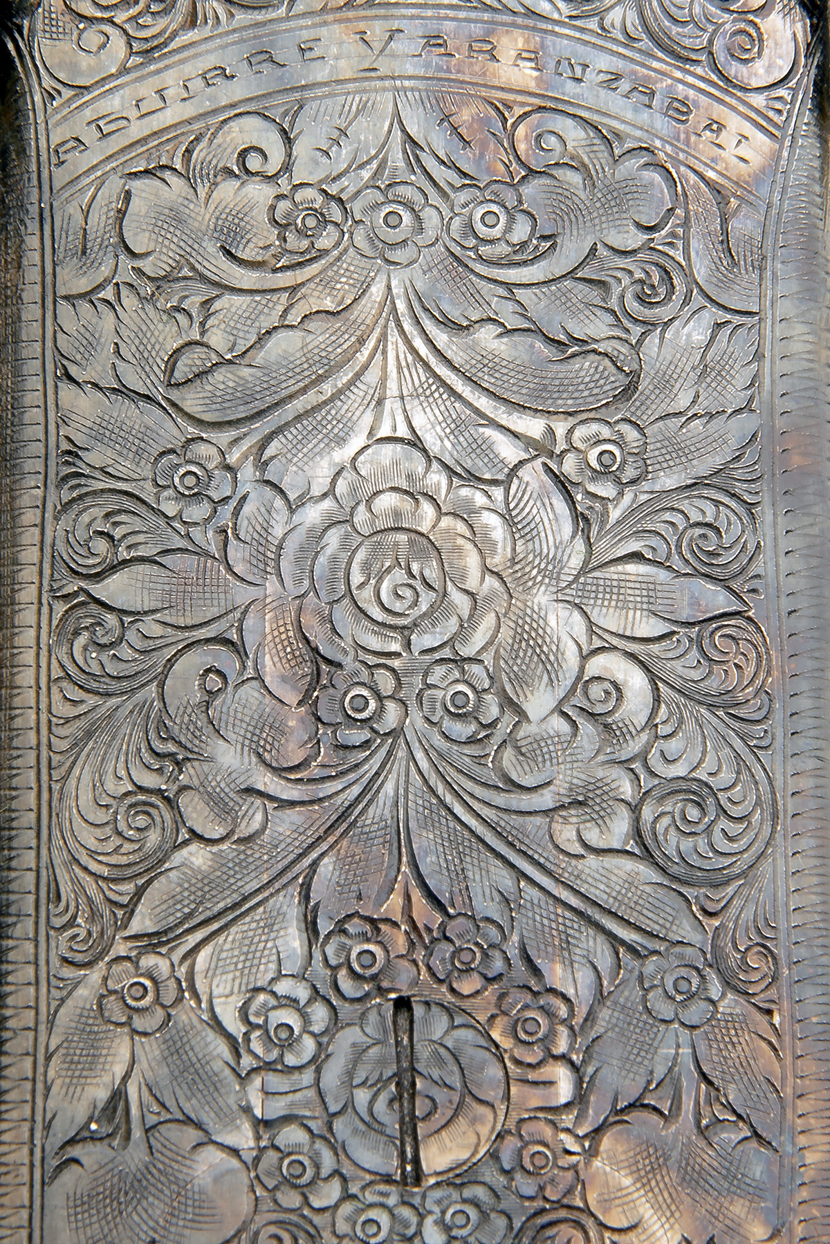 for 1976, 25in. nitro chopperlump barrels, matt Churchill-ribs gold-inlaid 'AYA' and '1' and '2' at the breech ends, 2 3/4in. chambers, bored approx. 1/4 and full choke (No.1) and true cyl. and 1/2 choke (No.2), toplevers gold-inlaid '1' and '2', removable striker discs, automatic safeties with gold-inlaid 'S' details, hand-detachable lockplates, gold-inlaid cocking-indicators, articulated front triggers, rolled-edge triggerguards, fully engraved with floral, scroll and ribbonwork, retaining virtually full original colour-hardening and finish, 14 3/8in. figured stocks, beavertail fore-ends, weight 7lb., in their leather case