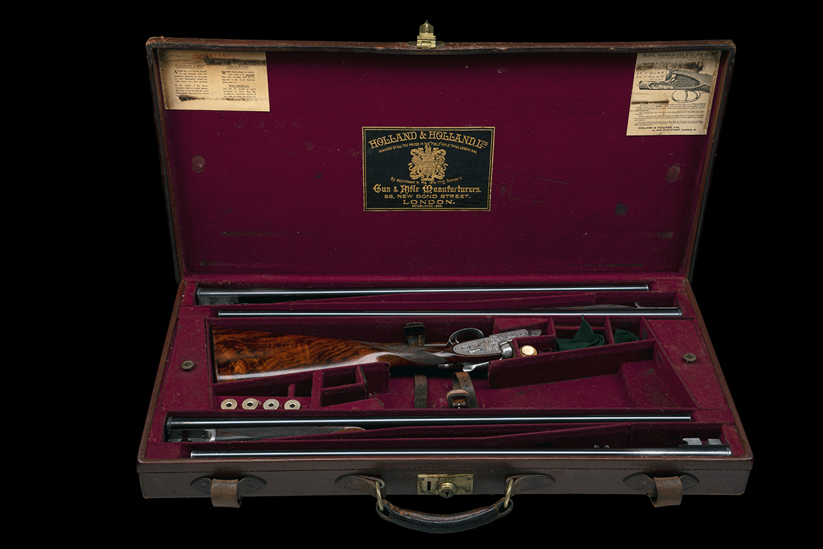 toplever gold-inlaid '2', automatic safety with gold-inlaid 'SAFE' detail, hand-detachable sidelocks, gold-inlaid cocking-indicators, semi-selective single trigger, rolled-edge triggerguard, best bold Royal scroll engraving, the lockplates gold-inlaid 'HOLLAND & HOLLAND', the underside with elaborate cartouches engraved 'ROYAL EJECTOR' and 'HOLLANDS SINGLE TRIGGER', bright finish overall, 14 3/8in. well-figured stock, cast on for the left shoulder, weight 6lb. 6oz., in its leather double guncase with provision for all sets of barrels; the case fitted for the pair and containing two sets of barrels (retaining fore-end) for the No.1 gun, serial no. 33468 (action missing);