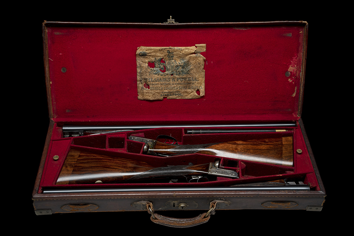 circa 1909, 28in. nitro barrels, ribs inlaid '1' and '2', and engraved 'WILLIAMS & POWELL. LIVERPOOL.', 2 1/2in. chambers, bored approx. true cyl. and 3/4 choke, unsigned treble-grip actions, toplevers inlaid '1' and '2', automatic safeties with inlaid 'SAFE' details, border and partial scroll engraving, retaining some original colour-hardening and finish, 15in. stocks including 1 1/8in. wooden extensions, weight 6lb. 13oz. (No.1) 6lb. 12oz. (No.2), in their brass-cornered leather double guncase