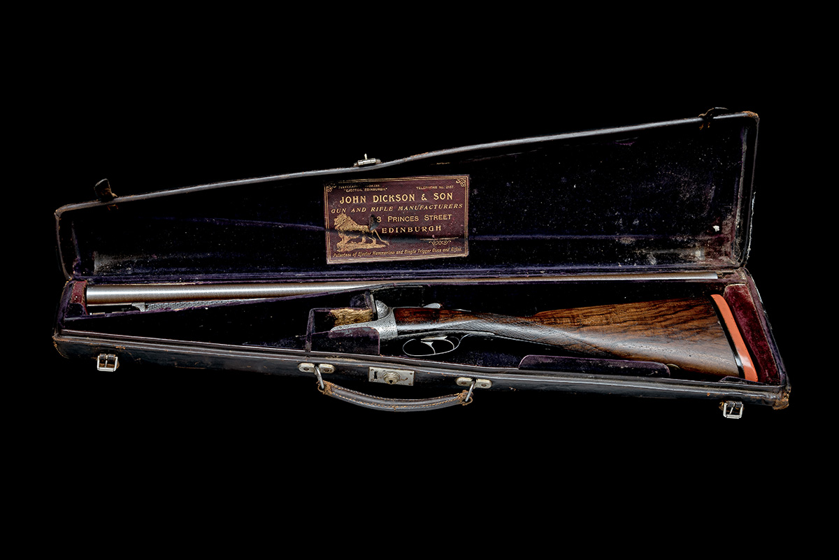 for 1900, 29in. fine damascus nitro barrels, the rib gold-inlaid '1' at the breech end, 2 1/2in. chambers, bored approx. true cyl. and 1/2 choke, left wall thickness at 17, Dickson patent round-action incorporating patents 9399 and 10621 of 1887, use number 829, the toplever gold-inlaid '1', automatic safety with gold-inlaid 'SAFE' detail, profusely engraved with bold acanthus scrollwork and with scrolling banners engraved 'JOHN DICKSON & SON PATENT' to the sides, 14in. figured stock including 3/4in. recoil pad, weight 6lb. 6oz., in its lightweight leather 'violin' case with purple velveteen lining and gold-tooled leather trade label