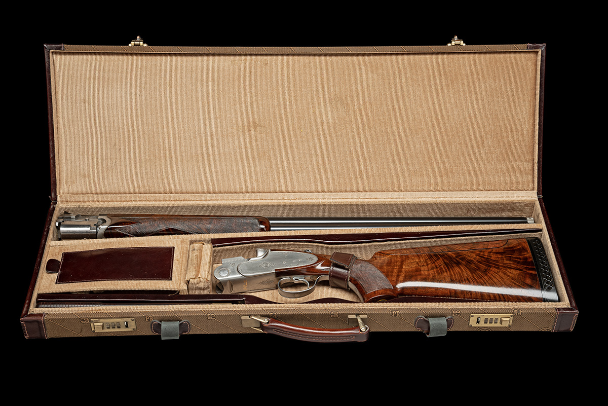 for 1991, 29 1/2in. nitro reproved barrels with 9mm ventilated matt top-rib, 2 3/4in. chambers, Teague multichokes (with spares), hold-open toplever pierced with a floral design and gold-inlaid with a crown, manual safety, border engraving with some acanthus detailing, the underside gold-inlaid with 'P. Beretta' in script, the triggerguard with 'TRAP', 14 3/4in. pistolgrip stock with sunburst figuring, palm swell, adjustable comb and 1in. ventilated rubber recoil pad, the pistolgrip inset with a circular escutcheon with the multi-coloured Olympic rings encircled with 'MELBOURNE - MUNCHEN - MOCKBA - LOS ANGELES', weight 8lb. 10oz., in its case