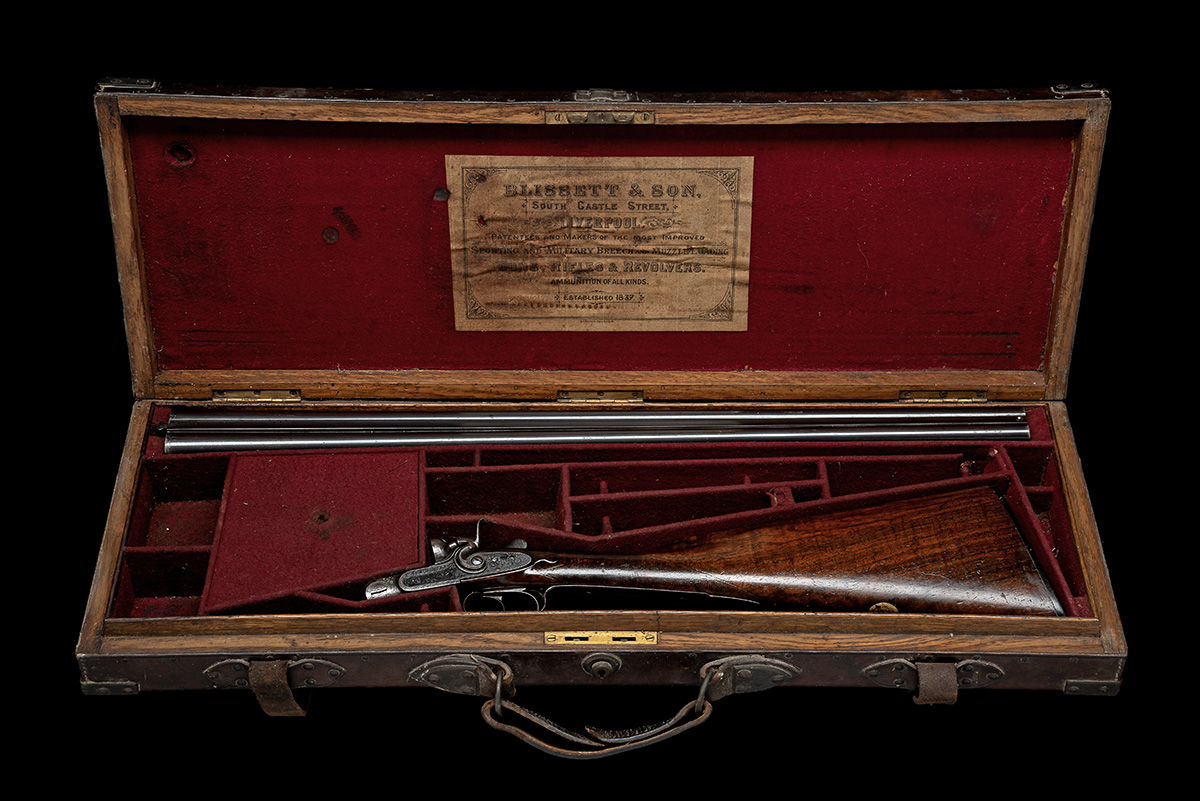 circa 1880, 24in. nitro reproved damascus barrels (reproved in 1992, shortened and pitted), rib engraved 'BLISSETT & SON. LIVERPOOL.', 3in. chambers, bored approx. 3/4 choke in both, treble-grip action, carved percussion fences, rebounding sidelocks, 14in. stock including buttplate, weight 4lb. 5oz., in its makers brass-cornered oak and leather guncase