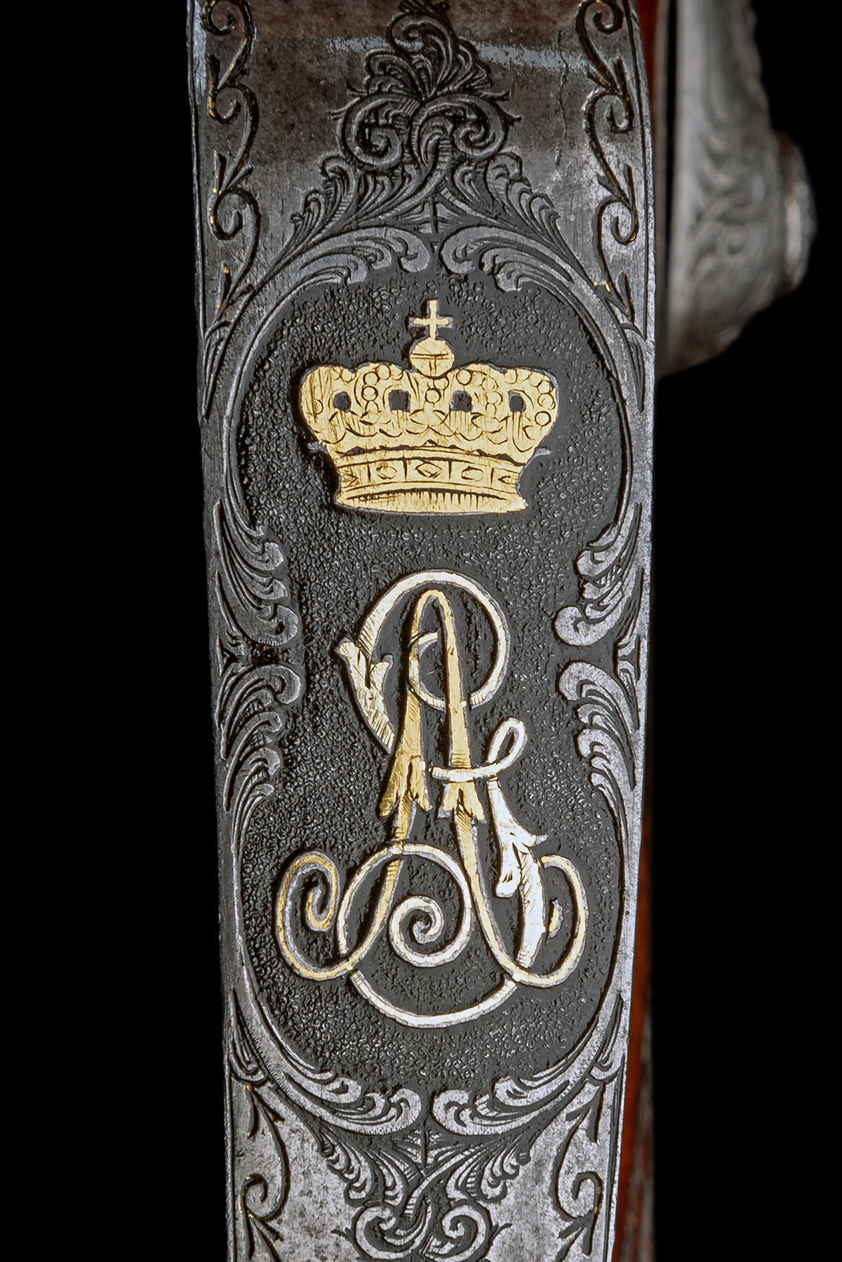 circa 1880, with blued 24 5/8in. side-by-side barrels, the flat raised top-rib signed in script 'J NOWOTNY HOFBUCHSENMACHER IN PRAG', dove-tailed blade fore-sight with auxiliary pop-up bead, adjustable notch ramp-rear-sight with additional folding leaf, scroll engraved rounded action-body, the engraving extending forwards onto breech-ends and rib of barrel, engraved flip-up flush fitting peep-sight mounted into the top-tang, border and scroll engraved back-action locks signed in banners 'J. NOWOTNY' on the left and 'A PRAGUE' on right, engraved dolphin-headed hammers, chequered walnut butt-stock with raised cheek-piece, iron heel-plate with central cartridge trap and moulded and carved horn tang-cover, single set triggers for both barrels, the trigger guard bow engraved with scrolls around a central panel inlaid with a gold crown over 'A', chequered walnut splinter fore-end with forward-facing chequered horn swing under-lever, cross-key barrel fastener and iron sling swivels