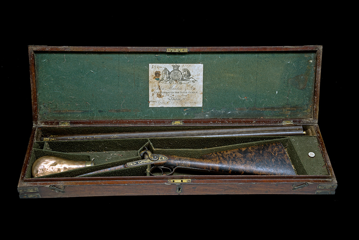 for 1834, with 30 1/2in. twist barrels, the raised top rib signed in gilt script 'JOHN MANTON & SON LONDON' and flanked by gilt arabesques, gilded acanthus scrolls to the breech-ends of both barrels and the top-rib, the gilding continuing around the engraved platinum vented plugs, further gilded border and acanthus scroll-work to the top-tang on a blued ground, the decoration repeated on the bar-action locks, each lock signed 'JOHN MANTON & SON, LONDON on gilt banners, gilded decoration to the hammer breasts and noses, birdseye maple unchequered half-stock (extensively inlet repaired at wrist and behind locks, well executed), plain iron furniture except yellow gold rectangular escutcheon engraved with a coronet at wrist and oval yellow gold escutcheons for the barrel key, working replacement ramrod, in a period mahogany storage case with brass corners, lined and compartmented in coarse green baize, original John Manton & Son parchment trade label inside lid, together with a Barlow patent flask