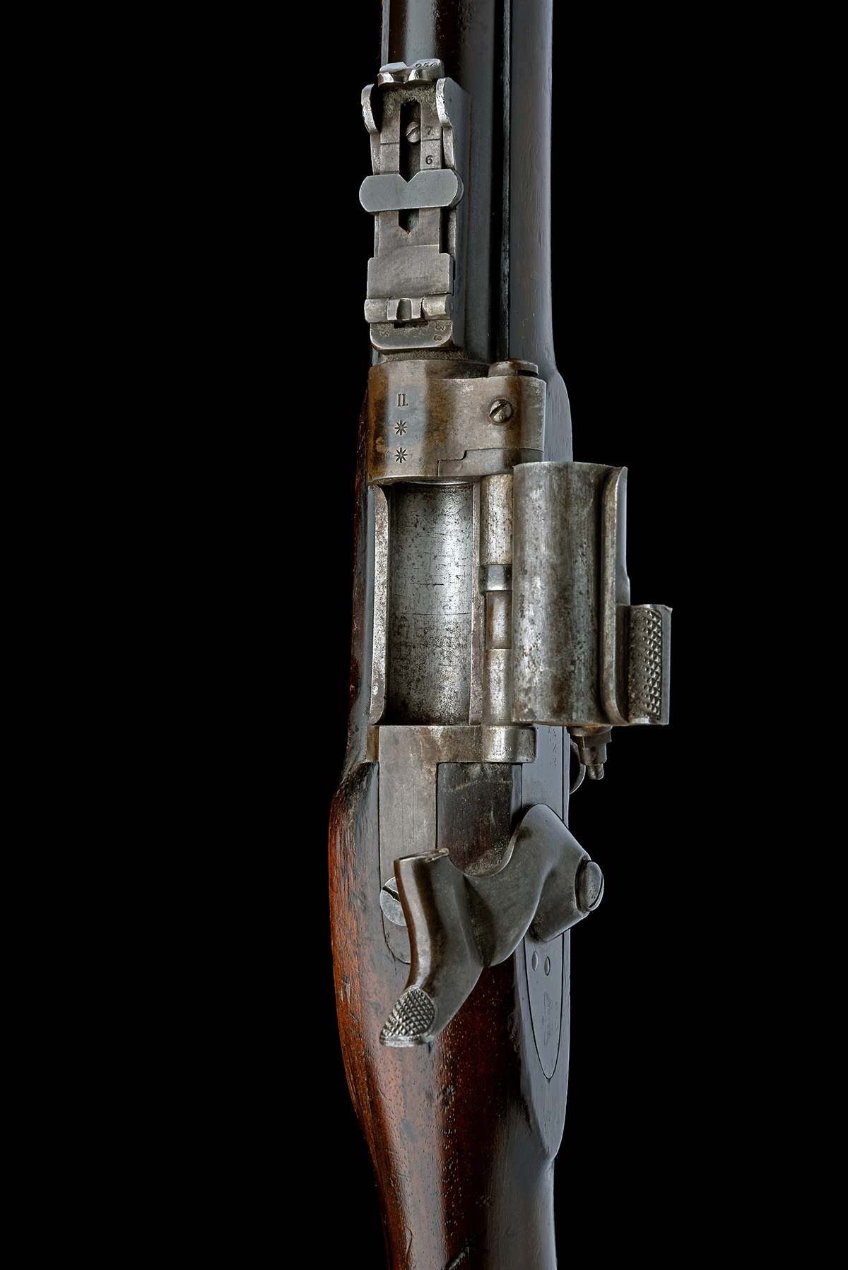 the rifle dated for 1860, with blued 36 1/2in. barrel, block and blade fore-sight, elevating ladder rear-sight, the receiver with flip-open breech with solid thumb-piece (traces of colour), signed and dated lock also with traces of colour, percussion style hammer, walnut full-stock with brass furniture, the spur of heel-plate with rack number, three iron barrel-bands, iron swivels and jag-ended clearing-rod, fitted with a good reproduction socket bayonet complete with black leather scabbard with brass mounts