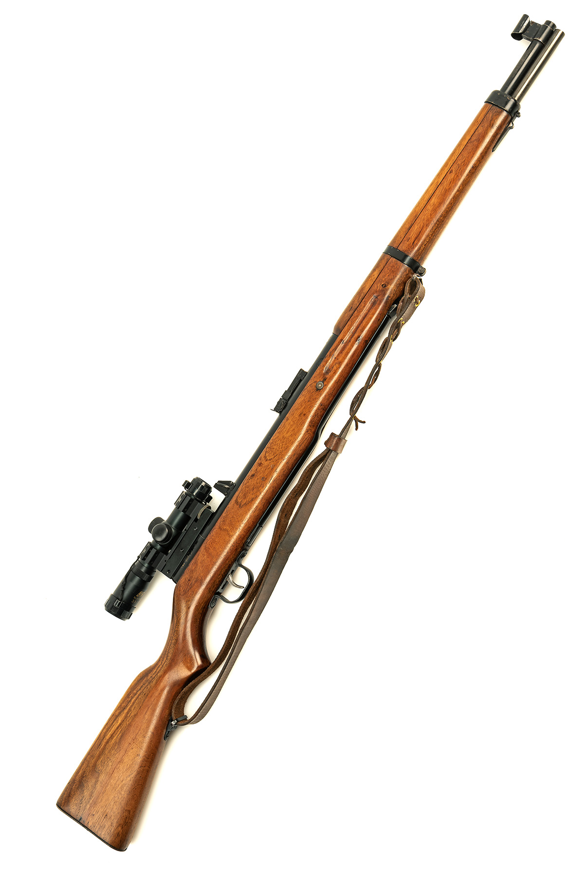 made in 1955 by Anschutz for the Egyptian Government and based on their 1954 model, with a 19 1/2in. barrel, raised fore-sight with tunnel protector, micro-adjustable fore-sight, lever-operated loading tap, the front of air-chamber stamped with a skull & crossbones device and Arabic markings for the National Union Youth Movement, larger 'U' shaped battle-sight midway along air chamber, further Arabic inscriptions to trigger-unit translating as 'Training Airgun Anschutz, Germany 1955', military style three-quarter wood stock, concealed under-lever and fitted with a later leather sling and compact 3x20 1in. bodied telescopic sight