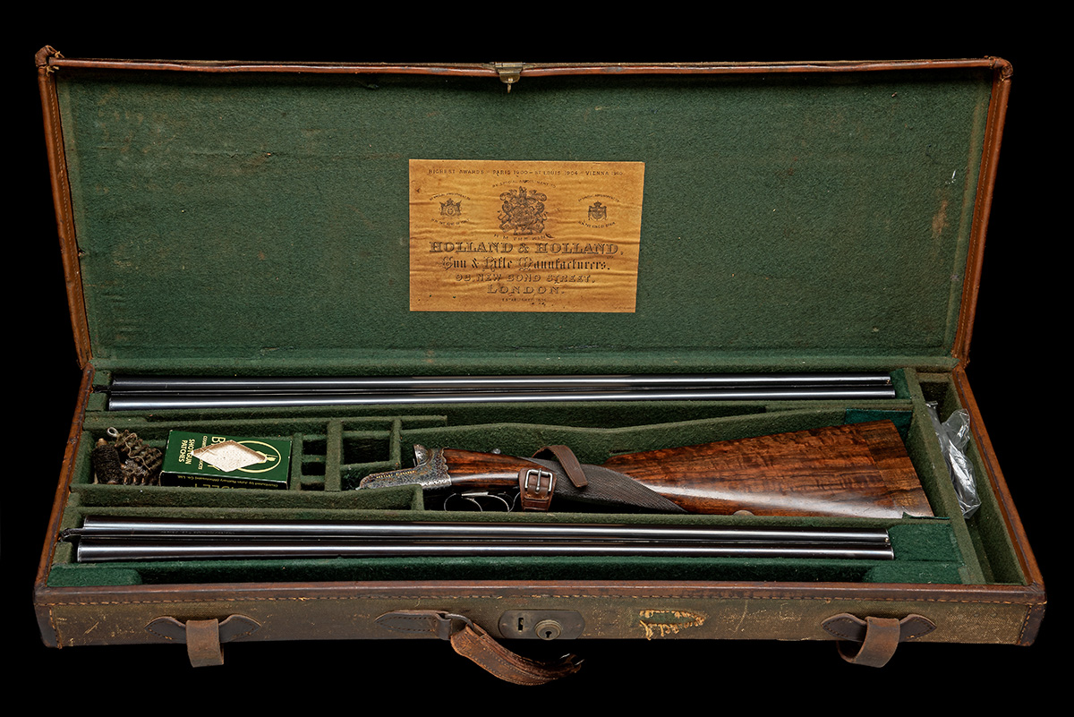 extra 28in. nitro barrels (by the makers in 1965), serial numbered 9030 / 19281, with beaded line and scroll bands at the breech end, rib engraved 'WESTLEY RICHARDS & CO., LONDON.', 2 3/4in. chambers, bored approx. 1/4 and full choke, scroll-back action with Westley Richards patent toplever, automatic safety with gold-inlaid 'SAFE' detail, detachable floorplate, J. Deeley and L.B. Taylor patent hand-detachable locks, patent No. 17731 of 28th July 1897, use number 1294, fully engraved with bold acanthus scrollwork on a matted background, the makers name inlaid in gold, retaining virtually full renewed colour-hardening and finish, 16 1/8in. well-figured stock (slightly cast on) including 1 3/8in. wooden extension, fore-end with Deeley & Edge patent release catch and horn finial, weight 6lb. 11oz. (original barrels) and 6lb. 9oz. (new barrels), in a canvas and leather case with provision for both sets of barrels and with a Holland & Holland trade label