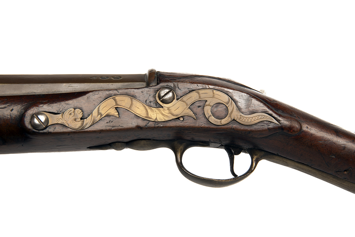 circa 1735, with heavy gauge brass octagonal to sixteen-sided to round 22in. banded cannon barrels, substantial moulded bands behind muzzles and at breeches, London proofs and 'L.B' maker's marks, solid plain iron top-tangs, brushed bright lock-plates signed 'L. BARBAR' (almost certainly modern-made replacements) with swan-necked cocks (other parts apparently absent bar one frizzen), walnut handrail full-stocks (one cracked at hand and repaired, some treated worm to fore-end), brass furniture including heel-plates with long shaped comb-spurs and pierced and engraved serpentine sideplates, squared iron swivels and brass-faced wood ramrods