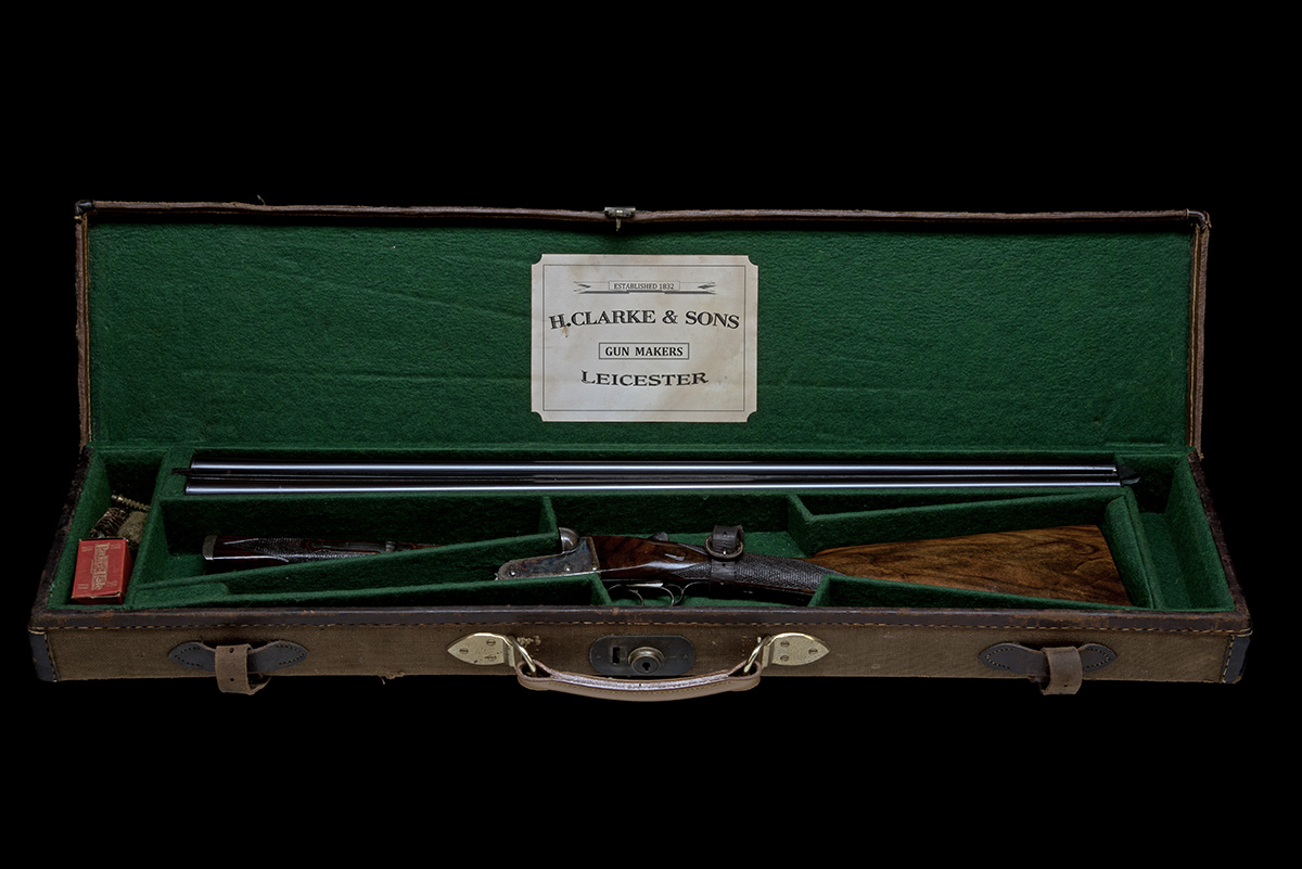 circa 1910, 27 7/8in. nitro reproved barrels (in 1969), rib engraved 'H. CLARKE & SONS. MIDLAND GUN WORKS. LEICESTER.', 2 1/2in. chambers, bored approx. true cyl. and 1/2 choke, treble-grip action, automatic safety, beaded border engraving with game scenes of pheasant, partridge and grouse, the triggerguard with duck in flight, retaining some colour-hardening and finish, 14in. figured stock, fore-end with Deeley & Edge patent release and horn finial, weight 5lb. 8oz., in a canvas and leather case