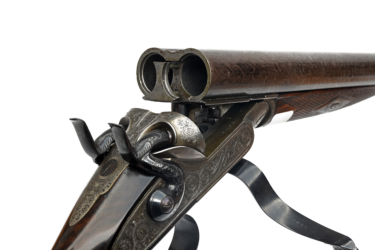 CHARLES LANCASTER 10-BORE (2 5/8IN.) DOUBLE-BARRELLED ROTARY-UNDERLEVER HAMMERGUN, serial no. 2805, circa 1855 (and conversion from muzzle loading or later build), 28in. nitro reproved bold twist damascus barrels (in 1970 at 2 5/7in.), the rib engraved 'CHARLES LANCASTER. 151. NEW BOND ST. LONDON.', Jones patent rotary-underlever, carved percussion fences, non-rebounding sidelocks, bold acanthus scroll engraving, the lockplates with scrolling banners engraved 'C. LANCASTER LONDON', the triggerguard with two hounds, the triggerguard tang with a brace of pheasant, brushed and blued finish, 14 3/8in. well-figured stock (some paint splashes) with steel buttplate, the buttplate with back strap engraved with scrollwork surrounding a scene of hound chasing fowl, fore-end with crosspin release and horn finial, weight 7lb. 14oz.