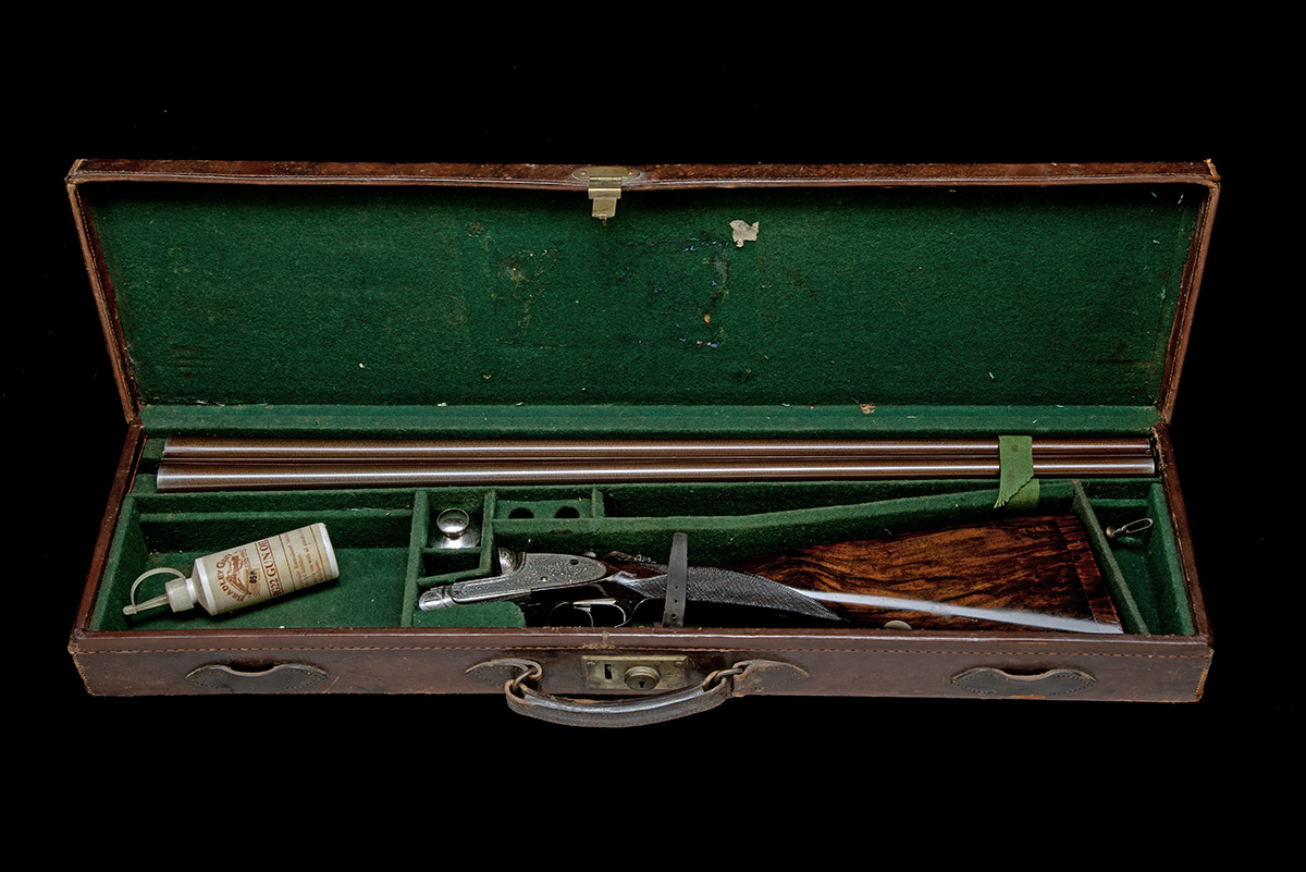 for 1894, 30 1/4in. nitro reproved fine damascus barrels, rib inscription rubbed, 2 1/2in. chambers, bored approx. true cyl. and 1/4 choke, removable striker discs, fluted fences, automatic safety with gold-inlaid 'SAFE' detail, fine acanthus scroll engraving, brushed bright and reblued finish overall, 15in. highly-figured stock including 5/8in. wooden extension, weight 6lb. 10oz., in a leather case