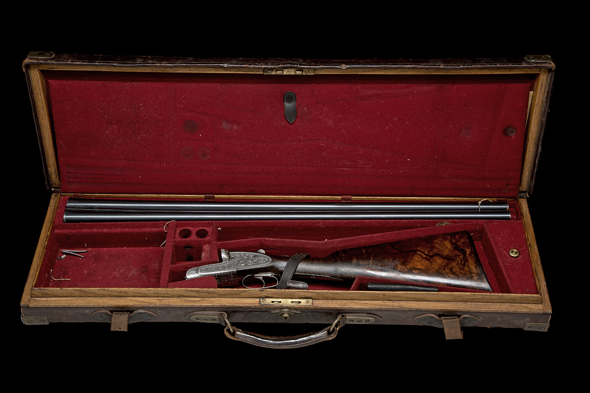 for 1900, 30in. nitro barrels, tubes engraved 'HOLLAND & HOLLAND. 98. NEW BOND STREET. LONDON.', 2 1/2in. chambers, bored approx. true cyl. and imp. cyl. choke, walls at 19 and 15, toplever engraved 'PATENT EJECTOR', automatic safety with gold-inlaid 'SAFE' detail, gold-inlaid cocking-indicators, best Royal scroll engraving, the underside with 'ROYAL HAMMERLESS EJECTOR' within an elaborate cartouche, brushed finish, 14in. figured stock (worn) including buttplate, weight 6lb. 9oz., right lockplate at fault, in its makers brass-cornered oak and leather guncase with internal protective flap
