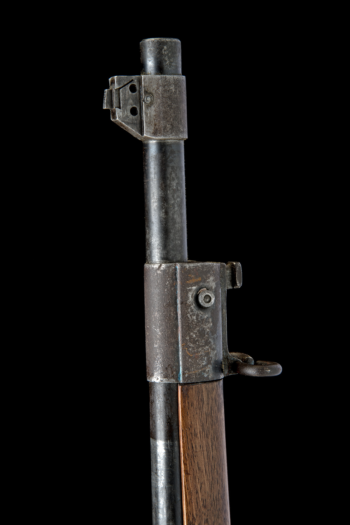 for 1914, 31 1/2in. nitro reproved barrel, block and blade fore-sight, receiver fitted with a flip-up adjustable aperture / notch sight, receiver ring marked 'ROSS RIFLE CO. CANADA. M-10. PATENTED.', bolt with manual safety marked 'SAFE' and 'READY', traces of colour-hardened finish remaining, full stock with top-cover, single barrel band, the right side marked '5/K/63 III. 892?/1914 DE', 13 1/8in. pull including steel buttplate, sling swivels, weight 9lb. 10oz.