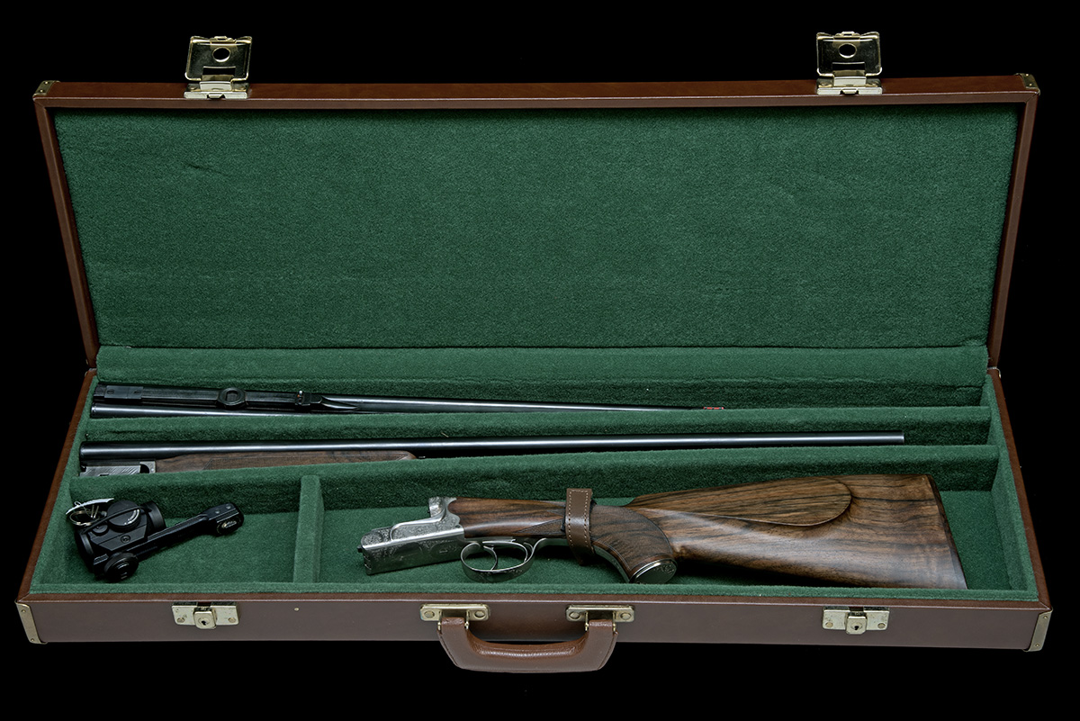 recent, 21 3/4in. nitro 9.3x74R rifle barrels with matt sight rib, high visibility open sights and ramp-mounted high visibility bead fore-sight, the breech end mounted with an Aimpoint Micro H-1 sight on a quickly-detachable rail mount;