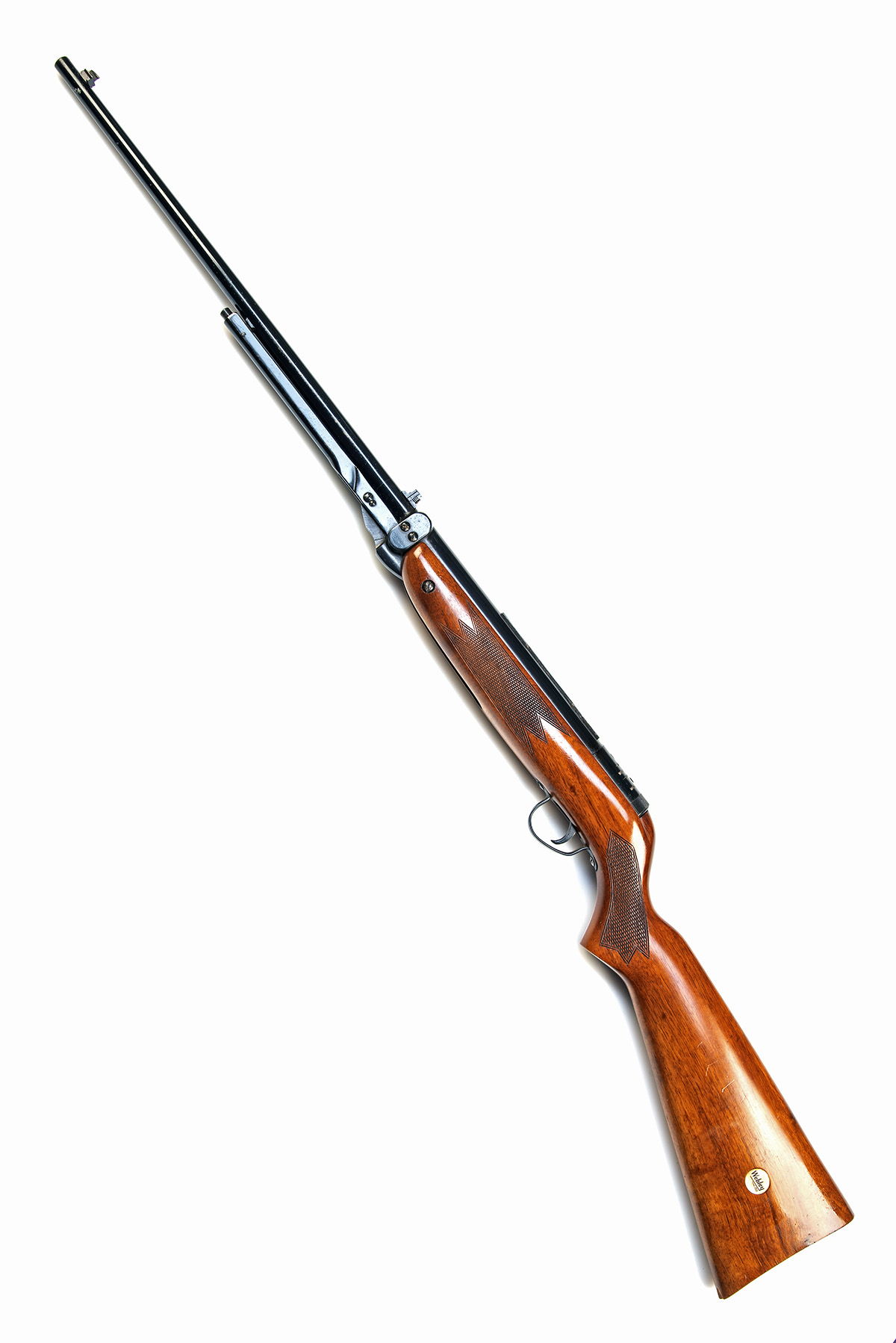 for 1964, with blued tapering 18in. barrel, dove-tailed block and blade fore-sight, elevating notch rear-sight, tap-action breech with removable side-plate, plain air-chamber with an applied telescopic sight rail of 'dumbell' form and marked with make and model details on the two-screw trigger unit, knurled end-piece, walnut half-stock factory chequered at wrist and fore-end, smooth heel (small flake chip at toe), the left side of butt with inset white plastic medallion marked 'WEBLEY' over 'REGD. TRADE MARK', guarded trigger and push-button release under-lever, generally collector's external condition