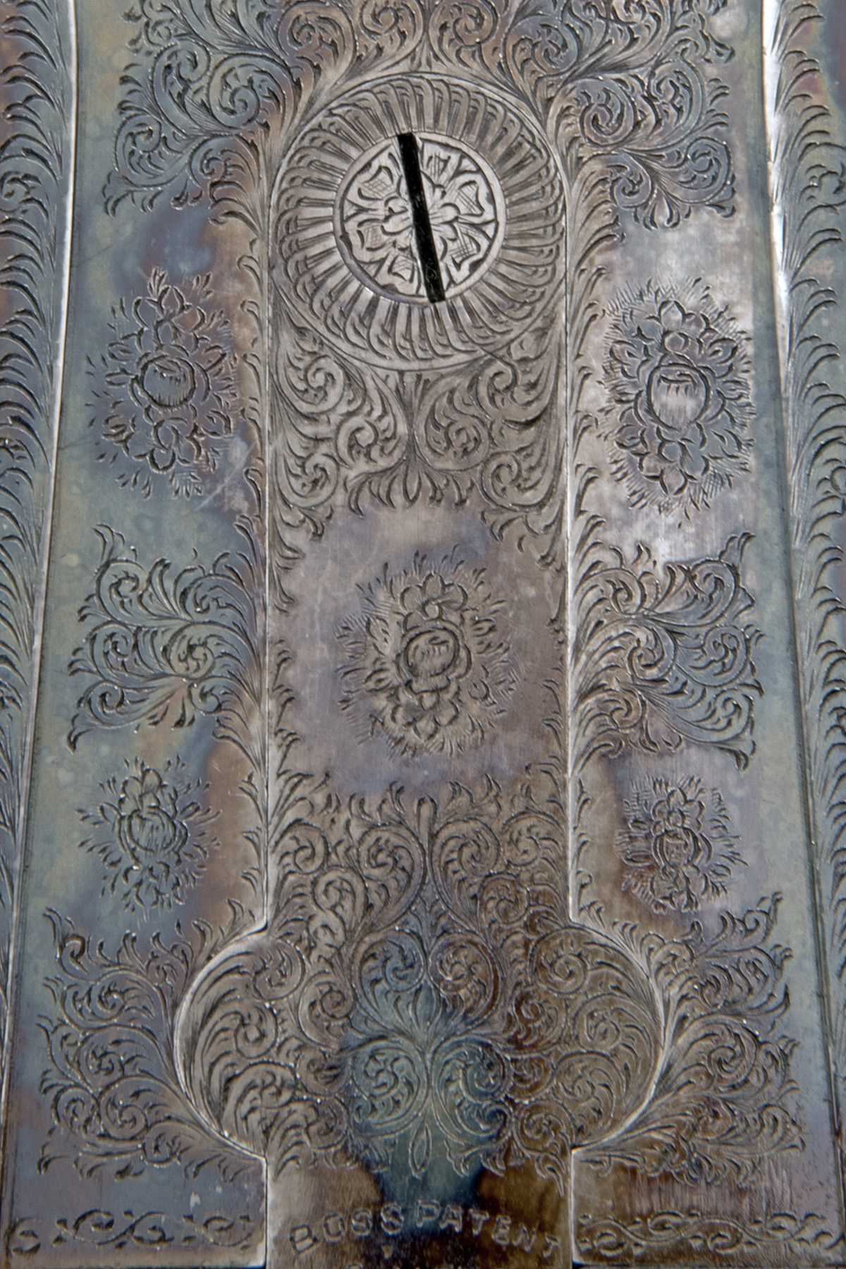 circa 1952, 26in. nitro chopperlump barrels, raised file cut rib, the tubes engraved 'BOSS & CO. 41 ALBERMARLE STREET PICCADILLY LONDON MADE IN ENGLAND', 2 3/4in. chambers, bored approx. 1/4 and 1/2 choke, removable striker discs, automatic safety with gold-inlaid 'SAFE' detail, gold-inlaid cocking-indicators, Boss 1905 patent improved single trigger, rolled-edge triggerguard, fine acanthus scroll engraving with floral bouquets, the triggerplate with 'BOSS PATENT NO 11278', retaining much original colour-hardening and some finish, 15 1/4in. figured stock including 1in. ebonite extension (original wood buttplate in case), weight 6lb. 7oz., in its leather case
