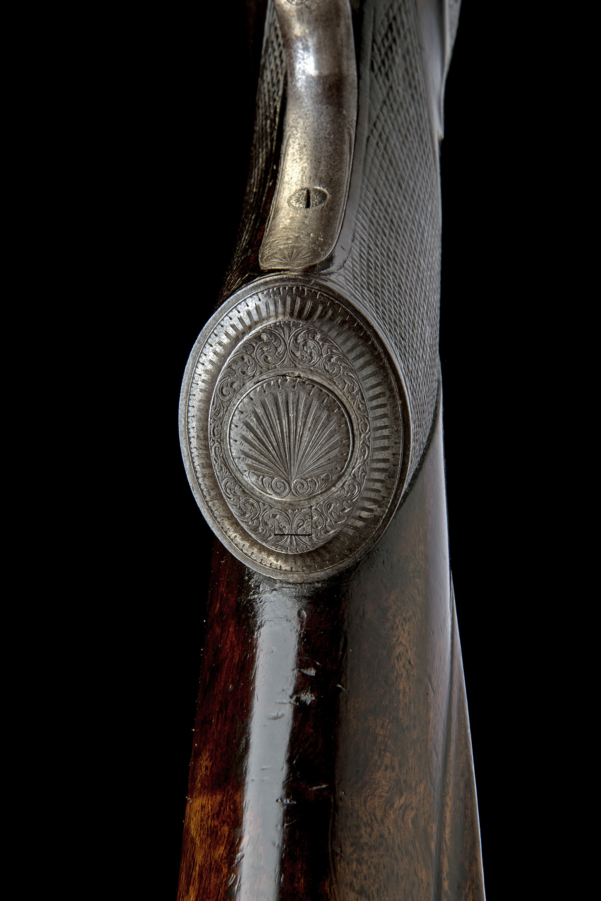"This shot and ball gun was originally London proved at 10 bore and later Birmingham reproved at 8 bore. There was also evidence of having had a rear-sight in the top-rib. Furthermore, stamped on each side of the stock was the name 'J. Taylor'. The patch box was engraved with a man on a horse shooting at a wild boar.