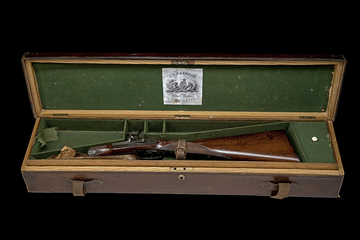 built on the 1862 patent with use number '28', with 29 3/4in. browned barrels marked 'DAMASCUS' to the underside and signed on the top-rib 'JOSEPH NEEDHAM PATENT 26 PICCADILLY LONDON', engraved starbursts around the pin apertures, border and scroll engraved action, border scroll and gamescene engraved bar-action locks, short side-lever to the right side opening the gun and placing the hammers on half-cock, chequered walnut butt-stock (cracked and repaired at wrist), iron furniture, chequered walnut splinter fore-end, in a period leather covered two-tier oak casing lined and compartmented in green baize, lift out tray for the stock and action, the lower tray for the barrels and ammunition