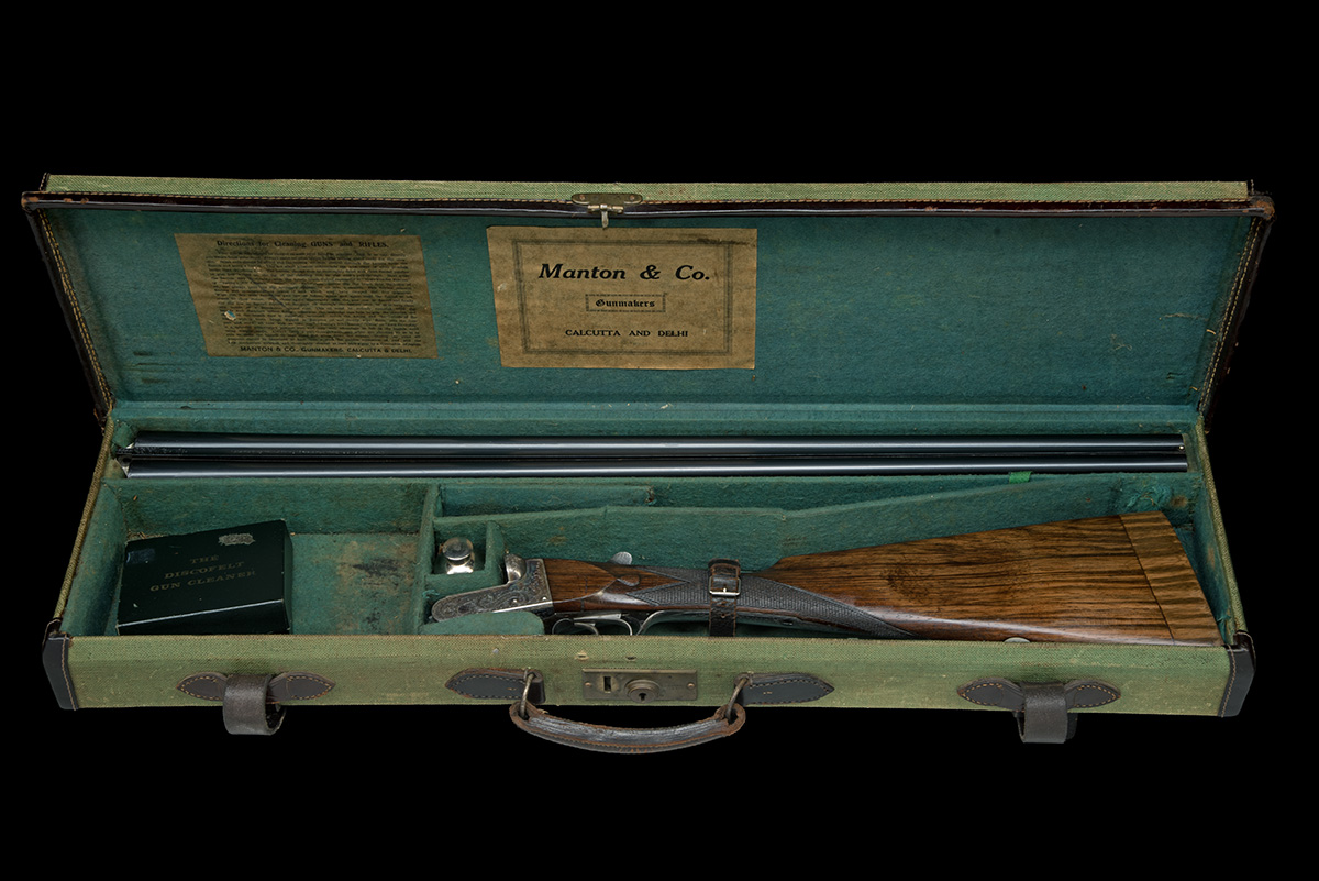 circa 1935, 28in. nitro barrels, the rib engraved 'MANTON & CO. GUNMAKERS. CALCUTTA & DELHI', 2 1/2in. chambers, bored approx. imp. cyl. and 3/4 choke, treble-grip action, toplever engraved 'EJECTOR', automatic safety with gold-inlaid 'SAFE' detail, bold acanthus scroll engraving with scrolling banners to the sides engraved 'MANTON & CO.', retaining traces of original colour-hardening and finish, 15 1/2in. stock carved at cheek and with 1 1/4in. wooden extension, weight 6lb., in its canvas and leather case with Manton & Co. Calcutta and Delhi trade label and Directions for Cleaning label
