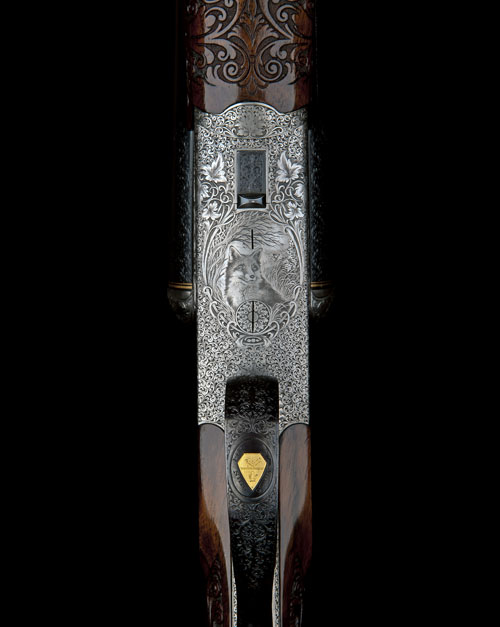 25in. nitro Bohler Spezial-steel barrels with raised matt rib, flip-up open sights and bead fore-sight, the breech end finely engraved with scrolling acanthus and gold-inlaid with a leaf and scroll design, mounted with a Zeiss Diavari-Z 1,5...6x42 T* telescopic sight in engraved and colour-hardened quickly-detachable mounts, bolstered treble-grip action with carved serpentine fences, gold-washed removable striker discs, gold cocking-indicators, sprung cocking-lever, shot / ball selector switch, hand-detachable lockplates with gold-washed internals and concealed flush release lever, gold-washed triggers, the front a set trigger, gold-washed ejector work, the action, lockplates and furniture profusely engraved with fine acanthus with scrolling leaf details, framing finely engraved vignettes of game scenes involving capercaillie and fox, the triggerplate signed 'GRAV. EISBACHER', the triggerguard gold-inlaid with a crest and with 'EX NIHILO NIHIL FIT' motto, bright finish, 14 1/4in. highly-figured pistolgrip stock with sculpted tiered cheekpiece, hogsback comb, finely engraved sprung ammunition trap, sling swivels, carved acanthus and fishscale chequering, the fore-end decorated en suite, weight 9lb. 15oz.