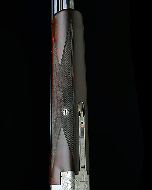 26 1/2in. nitro barrels with 8mm ventilated matt top-rib, 2 3/4in. chambers, bored approx. 1/4 and 1/2 choke, hold-open toplever, automatic safety with integral barrel selector switch, gold-washed single trigger, carved oak leaf fences, the action with border and acanthus scroll engraving surrounding vignettes of a brace of pigeon in flight, old silver finish, 14 1/4in. semi-pistolgrip stock including buttplate, weight 7lb. 4oz., in its makers fur-lined case