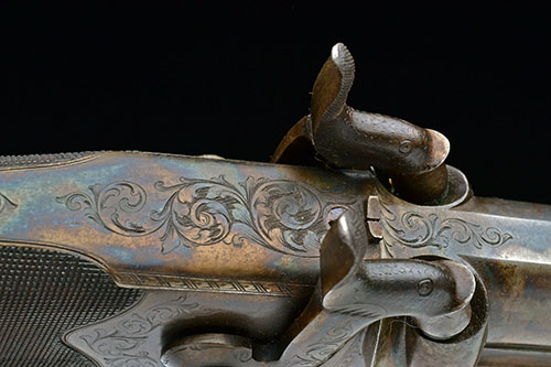 circa 1850, with round colour-hardened London proved 5 1/2in. barrels, flat sighting-plane signed 'DOOLEY N. RANELAGH ST. LIVERPOOL', engraved band at the muzzles, scroll engraving to the breech-end, silver bead fore-sights, standing notch rear-sights to the scroll engraved top-plates, radiused corner border and scroll engraved side-hammer colour-hardened boxlock actions, scroll engraved dolphin-headed hammers, fire-blued sprung belt-hooks to the left hand side, extremely fine chequered walnut butts with engraved colour-hardened butt-caps with centrally mounted trapdoor cap-boxes, scroll engraved trigger-guard bows and captive iron ramrods with scroll engraved stirrups, both pistols remaining in a remarkable state of preservation and appearing little used TOGETHER WITH their manufacturers mahogany storage case, compartmented and lined in green baize (lid re-lined), parchment Dooley trade-label to inside of lid and complete with a number of period accessories including an embossed three-way flask (Riling 461), a scissors ball-mould, a cap-tin, a turn-screw, a nipple-key, an oil-bottle and a mahogany loading rod