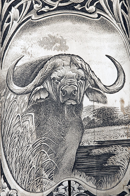 26in. nitro chopperlump barrels (London proofed 1990), sight rib engraved 'DANL. FRASER & CO. CROMARTY. BLACK ISLE. SCOTLAND', with open sights and folding leaf sight with gold-inlaid sight lines, ramp-mounted bead fore-sight, the breech end mounted with a Swarovski 1,25-4x24 Habicht telescopic sight, serial no. P663340186, in quickly-detachable mounts, the rings with ropework border engraving, the front ring finely engraved with a central thistle motif, action with side-bolsters, removable striker discs, elongated top tang, automatic safety, hand-detachable lockplates (internally signed Joseph Brazier Ashes) with gold-inlaid cocking-indicators, articulated front trigger, rolled-edge triggerguard, the action, lockplates and furniture finely carved in high relief with stylised scrolling acanthus and floral motifs on a dark matted background, the lockplates with finely engraved vignettes in bulino style of a leopard to the left and a lion to the right, the underside with a cape buffalo, the triggerplate signed 'FAUSTI G Creative Art', bright finish overall, 14 5/8in. well-figured pistolgrip stock with cheekpiece, engraved steel pistolgrip-cap (with trap), sling swivels, including 5/8in. leather-covered recoil pad, beavertail fore-end, weight 10lb. 5oz. (unscoped) and 11lb. 13oz. (with scope), in its fitted leather case with canvas and leather outer cover