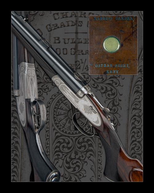 24 3/8in. sleeved nitro barrels (converted from .360 2 1/4in. calibre), file cut sight rib with open sights, ramp-mounted bead fore-sight, the breech end mounted with a Zeiss Varipoint VM 1,1-4x24 T* telescopic sight, serial no. 2507327, in quickly-detachable mounts, treble-grip action with hidden third bite, removable striker discs, manual bolted safety with gold-inlaid 'SAFE' detail, elongated top strap, hand-detachable lockplates, gold-inlaid cocking-indicators, chequered front trigger, fine border and acanthus scroll engraving, the underside with ovate detail 'CHARGE 30 GRAINS CORDITE. BULLET 300 GRAINS. .360 CASE 2 1/4 INCHES', brushed bright finish overall, 14 3/8in. well-figured pistolgrip stock with cheekpiece, engraved steel pistolgrip-cap (with trap), sling swivels and basketweave horn buttplate, weight 7lb. 8oz. (unscoped) and 8lb. 13oz. (with scope), in its brass-cornered oak and leather case with internal protector flap, the lid exterior embossed 'MARQUIS CAMDEN. BAYHAM ABBEY. KENT' (no provision for the telescopic sight)