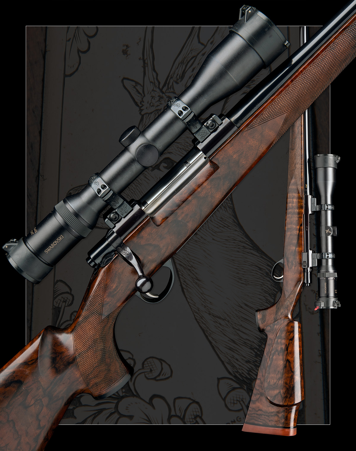 24 1/2in. unsighted nitro barrel with an elaborate acanthus scroll cartouche surrounding 'C. S. COTTON' inlaid in gold, the knox form gold inlaid 'No.1' and with a gold line detail at the muzzle, the receiver mounted with a Swarovski 2,5-10x42 Habicht telescopic sight, serial no. P644009102, in oak leaf and acorn engraved mounts, hinged floorplate with acorn and oak leaf bordering around a central depiction of a roe buck, the triggerguard gold-inlaid 'CC', highly-figured pistolgrip stock with palm swell, cheekpiece, monte carlo comb, pistolgrip-cap, quickly-detachable sling swivels, 14 1/8in. pull including 1in. rubber recoil pad, in a Peli 1750 copolymer transport case
