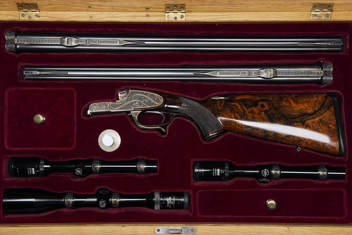 23 3/4in. nitro 8x75RS barrels, raised sight rib fully engraved with fine acanthus scrollwork and with gold line highlights, folding open sights, ramp-mounted blade fore-sight, the breech end with quickly-detachable telescopic sight mount bases; the case fitted with three telescopic sights in scroll-engraved and gold-inlaid quickly detachable mounts, two Zeiss Diavari-C 1,5...4,5x18 sights and a Zeiss Diavari-Z 2,5-10x48T* ; action incorporating Franz Jaeger 1906 patent 'kippblockverschluss' sprung breechblock, ornately carved fences, manual tang safety, cocking-indicators, the action, lockplates and furniture fully engraved with fine acanthus scrollwork in a concentric design, with flowing gold-line highlights forming sweeping cartouches engraved with the makers details, retaining virtually full delicately colour-hardened finish, 14 1/4in. exhibition grade pistolgrip stock, steel pistolgrip-cap decorated en suite, sling eyes, 1/2in. rubber recoil pad, weight 8lb. 3oz. (.375 H&H barrels, no 'scope) and 7lb. 7oz. (8x75JS barrels, no 'scope), in its claret velveteen-lined fully fitted brass-cornered oak and leather case