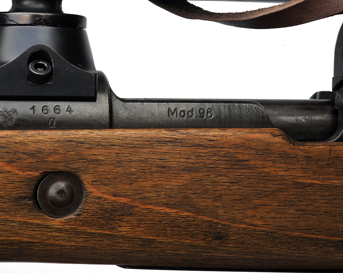 24in. nitro barrel, protected ramp-mounted foresight, tangent rear-sight graduated to 2000 meters with reproduction leather cover, fitted with a period Carl Zeiss Zielvier telescopic sight with reproduction mounts, reproduction lens covers, action with cut-out and marked 'Mod.98', extended flag safety, reproduction winter trigger, detachable floorplate, steel butt-plate with leather side sling, non matching serial numbers