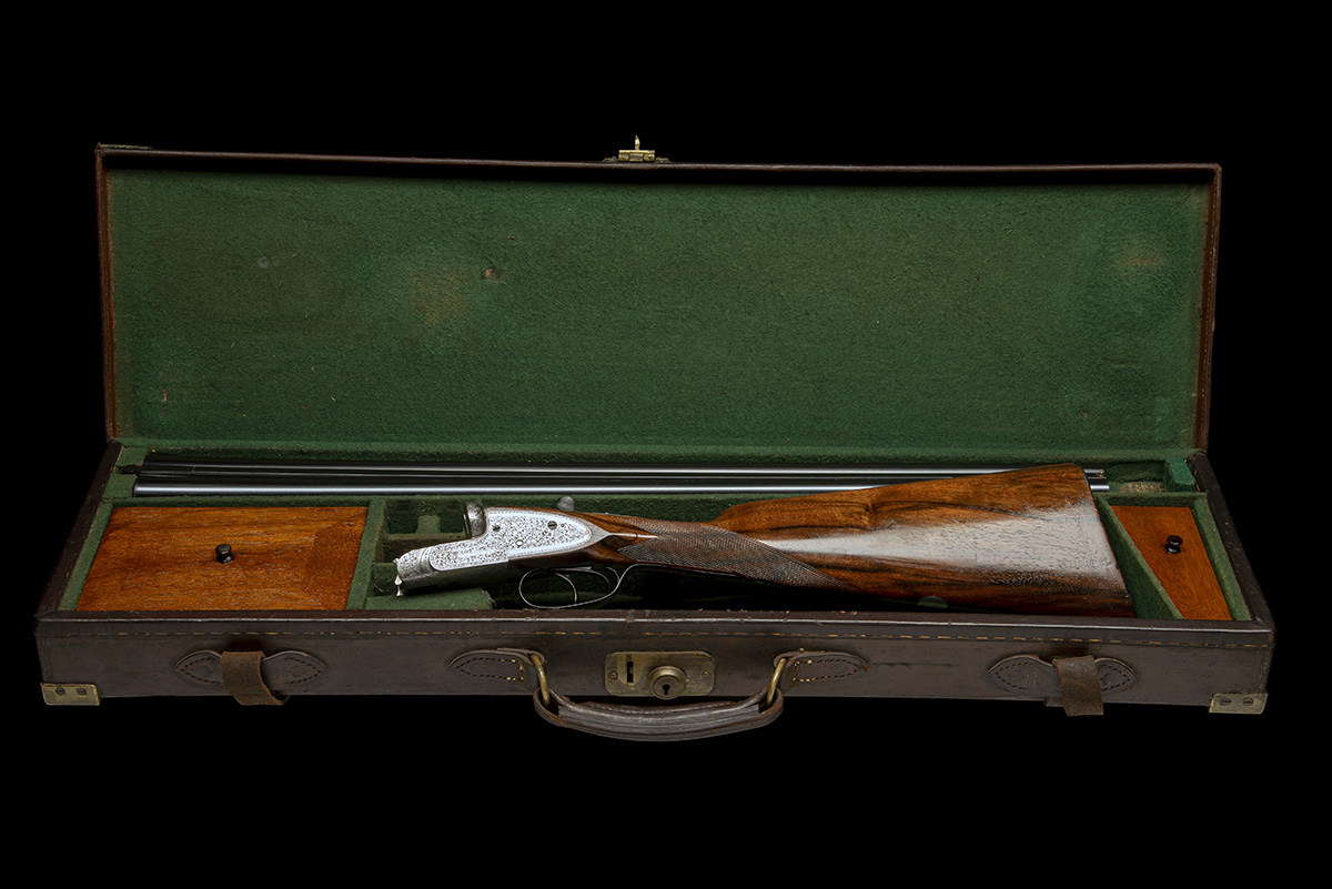 for 1916, 28in. nitro barrels, the rib engraved 'WILLIAM EVANS. 63. PALL MALL. ST. JAMES'S. LONDON.', 2 1/2in. chambers, bored approx. 3/4 choke in both, some pitting, right bore dimension marginal, treble-grip action with removable striker discs, automatic safety with gold-inlaid 'SAFE' detail, bold acanthus scroll engraving, brushed bright and reblued finish overall, 15in. figured stock with engraved steel heel and toe plates, weight 6lb. 5oz., in a brass-cornered leather case