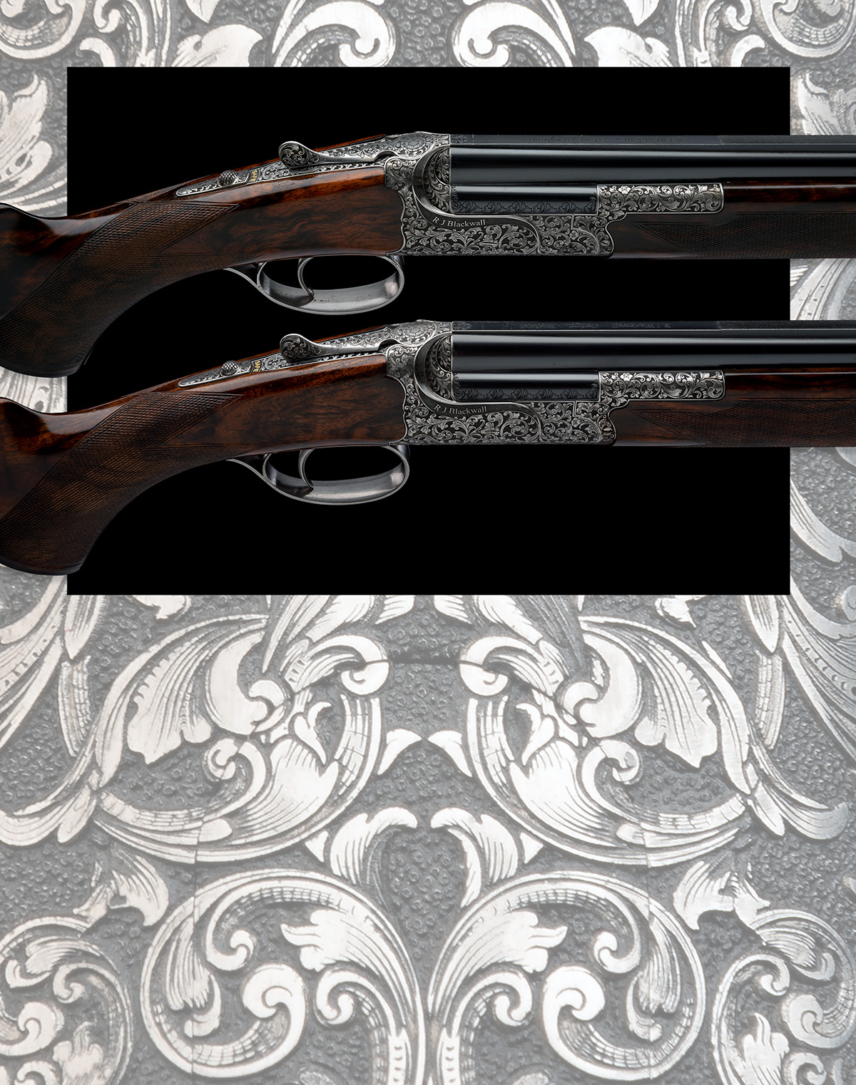 for 2016, 32in. nitro barrels with 7mm solid raised file cut top ribs, engraved at the breech-ends, 'R J BLACKWALL - OXFORD - ENGLAND' with acanthus scroll engraving at the breech-ends, 2 3/4in. chambers, bored approx. 1/2 choke in all, hold-open toplevers, automatic safeties with gold-inlaid 'SAFE' details, scroll-back actions with carved matted side bolsters relief engraved 'R J BLACKWALL', non-selective single-triggers, double-rolled edge triggerguards, the actions and furniture carved in high relief with bold acanthus scrollwork on a matted background, 15in. highly-figured pistolgrip stocks with pistolgrip caps, fore-ends with Deeley & Edge patent release levers and engraved en-suite, weight 6lb. 7oz.