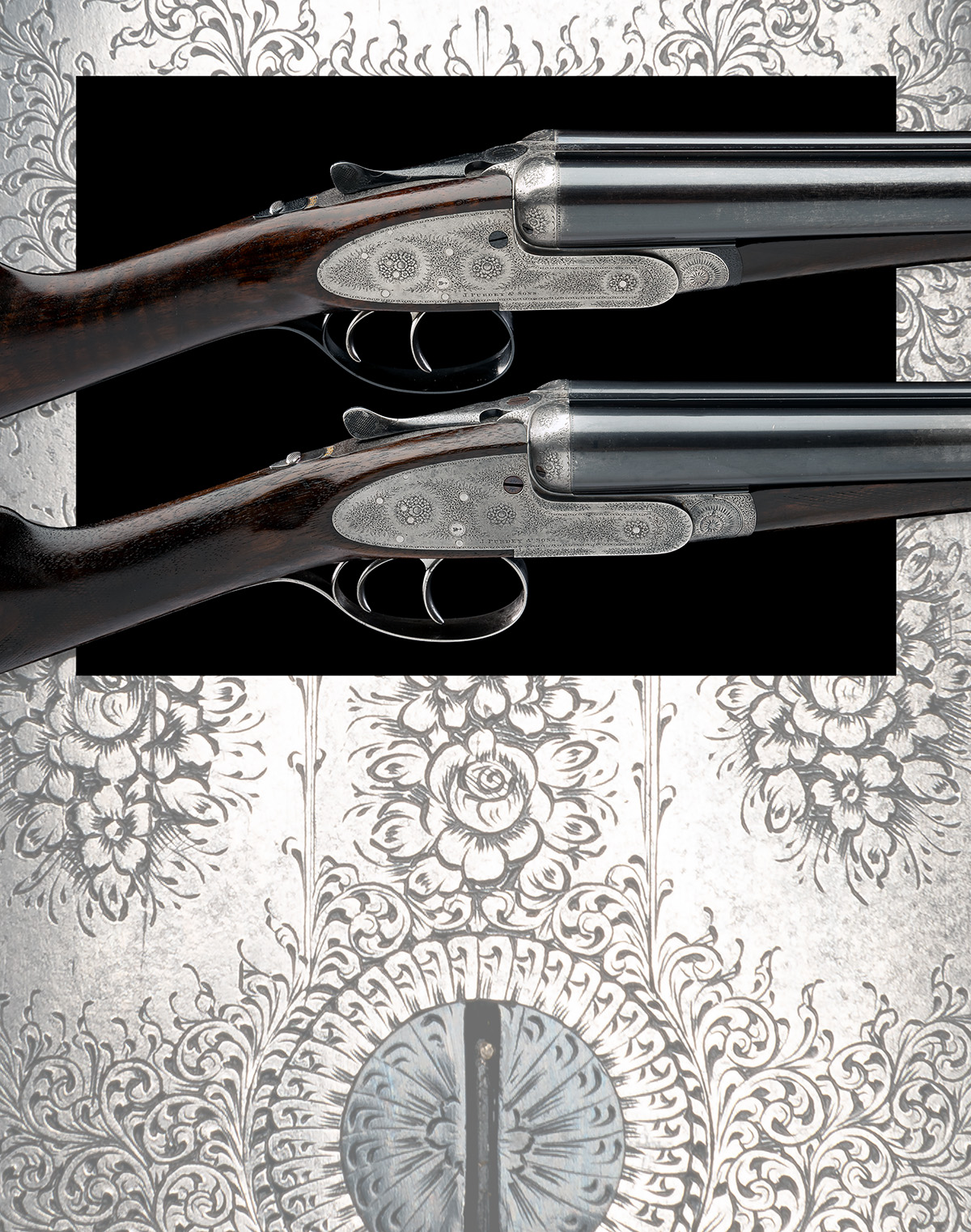 for 1900, 30in. nitro reproved Whitworth-steel chopperlump barrels (loose on actions, some pits and dents No.1), ribs engraved 'J. PURDEY & SONS, AUDLEY HOUSE, SOUTH AUDLEY STREET, LONDON. MADE OF SIR JOSEPH WHITWORTH'S FLUID PRESSED STEEL.' (worn No.2), 2 1/2in. chambers, bored approx. imp. cyl. and 1/2 choke, toplevers engraved '1' and '2', removable striker discs, automatic safeties with gold-inlaid 'SAFE' details, arrow cocking-indicators, best fine acanthus scroll engraving with floral bouquets, brushed bright finish, 15in. figured stocks including 7/8in. wooden extensions, fore-end woods with losses and minor crack to wood No.2, weight 7lb. (No.1) and 6lb. 14oz. (No.2)