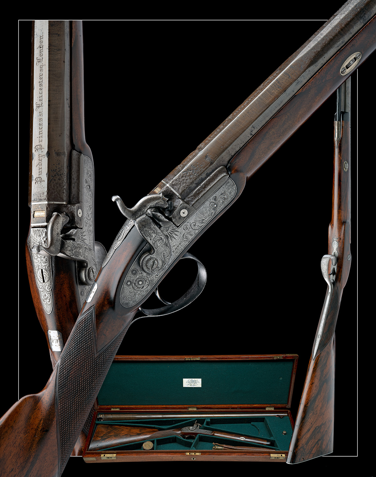 for 1824, with 30in. three stage octagonal to polygonal to round barrel, the top flat at the breech engraved 'PURDEY, PRINCES ST. LEICESTER SQUARE, LONDON' (refreshed), patent breech with two platinum lines and poincon stamped 'PURDEY LONDON', foliate engraved fixed breech with some loss to engraving from flash erosion and pitting, borderline engraved lock with a sunburst to centre top and panels of foliate scroll work and the makers name 'PURDEY' to centre, the cock with dolphin head and engraved to match, the nose worn and partly missing, figured walnut half-stock, with chequered wrist (refreshed) inset with a silver escutcheon initialled 'W.W.', the iron mounts, long tang decorated with foliate engraving, the trigger-guard engraved to match (engraving faint and worn), replacement horn nose-cap, the barrel rebrowned over pitting, particularly at breech, stock refinished with some well executed repairs, contained in a refurbished relined and partitioned green baize lined brass-bound mahogany case, the lid with reproduction Purdey trade card, accessories include a leather shot pouch and a mainspring cramp