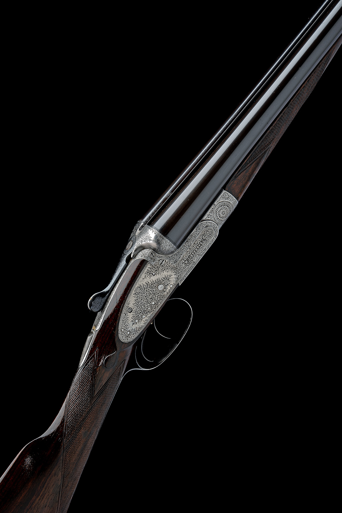 circa 1897, 25 1/2in. replacement nitro barrels, 2 1/2in. chambers, bored approx. true cyl. and 1/2 choke, treble-grip action, automatic safety with gold-inlaid 'SAFE' detail, beaded border and acanthus scroll engraving, brushed bright finish, 14 1/4in. stock (cast on for a left-hander) including buttplate, weight 5lb. 11oz.