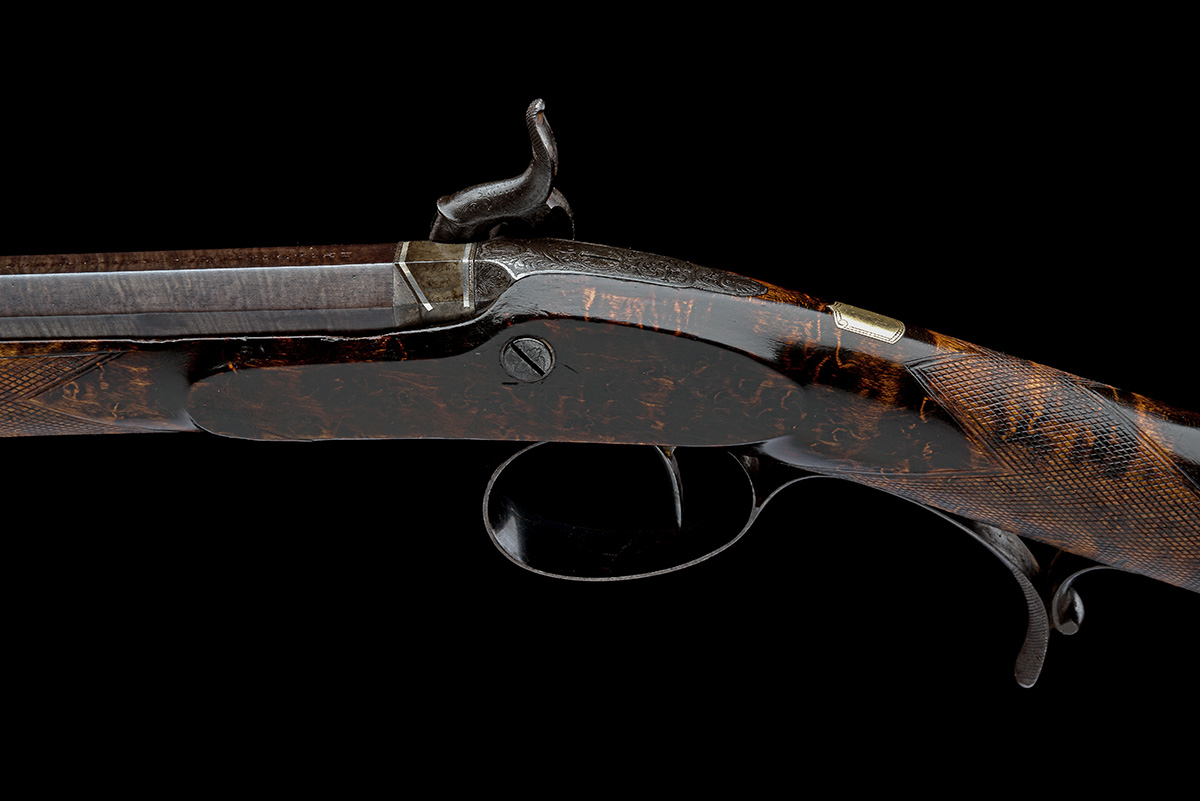 for 1828, with expertly rebrowned octagonal 26in. barrel rifled in eight grooves, the top-flat signed 'I. PURDEY, No. 314 1/2 OXFORD STREET LONDON', bead fore-sight, the muzzle also shallow dove-tailed for a tunnel protector (absent), standing notch rear-sight with additional folding leaf, colour hardened squared breech with twin platinum lines and vented plug, border and scroll engraved top-tang, borderline and scroll engraved bar-action lock signed 'PURDEY', sliding safe behind the engraved hammer, chequered birdseye maple half-stock with raised cheek-piece, iron furniture including chequered raised finger-spur to the lower tang, gold border engraved escutcheon to the wrist and the barrel key and bun-tipped ebony ramrod, complete with its manufacturer's mahogany storage case lined and compartmented in green baize, original parchment trade label inside lid and retaining it flask, nipple pot, cleaning rod and with some extra added accessories