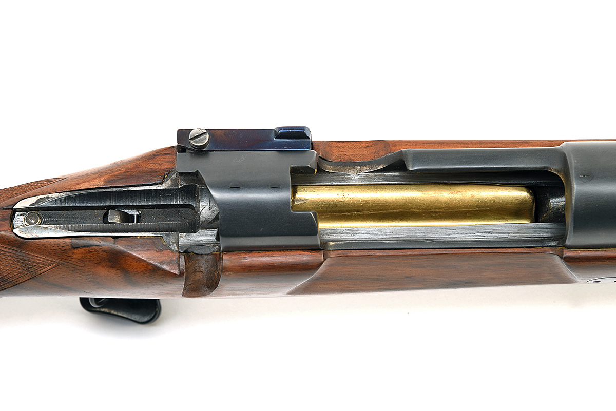 JOHN DICKSON & SON. .270 WIN. BOLT-MAGAZINE SPORTING RIFLE, serial no. 74173, circa 1975, 21 1/4in. nitro reproved barrel (in 2026), threaded muzzle with thread cap, open rear sight with two folding leaf sights, marked for 100, 200 and 300 yards, engraved 'JOHN DICKSON & SON. 21 FREDERICK STREET. EDINBURGH.' and 'CALIBRE .270', receiver with thumb cut-out, drilled on for scope mount bases, with screw blanks fitted, manual colour-hardened flag safety with gold-inlaid 'SAFE' detail, timney trigger, gold-washed magazine lifter, hinged floorplate, pistolgrip halfstock with horn pistolgrip cap and fore-end finial, cheekpiece, 15in. pull including rubber recoil pad, weight 8lb. 4oz.