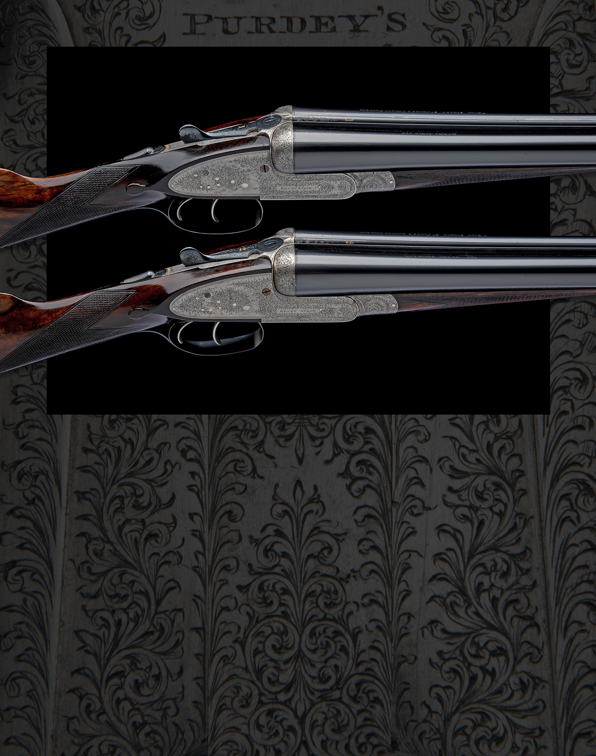 circa 1899, 28in. replacement nitro barrels (post 1954), the ribs gold-inlaid '1' and '2' at the breech ends, the tubes engraved 'HENRY ATKIN LTD. 7, BURY STREET, ST. JAMES'S, LONDON, ENGLAND.', 2 1/2in. chambers, bored approx. 1/4 and 1/2 choke, toplevers gold-inlaid '1' and '2', automatic safeties with gold-inlaid 'SAFE' details, fine acanthus scroll engraving with some beaded bordering, the undersides with elaborate cartouches engraved 'HENRY ATKIN FROM PURDEY'S', brushed bright and reblued finish, 14 3/4in. well-figured stocks including 5/8in. recoil pads, small chip to No.2 fore-end wood, weight 6lb. 11oz. (No.1) and 6lb. 10oz. (No.2), in a brass-cornered oak and leather case
