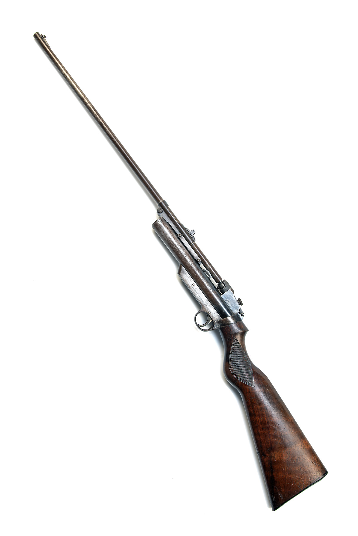 circa 1937, with sighted detachable 25 1/2in. barrel, rotating bolt barrel-lock, folding 'H' frame peep-sight to rear of receiver, push-button barrel release to the barrel cradle, plain air chamber stamped with the model details to the left side and five lines of patents to the right, trigger unit with manufacturer's details and no provision for safety catch, chequered walnut semi pistol-grip saw-handled butt-stock and no provision for fore-end, fair traces of original finish remaining