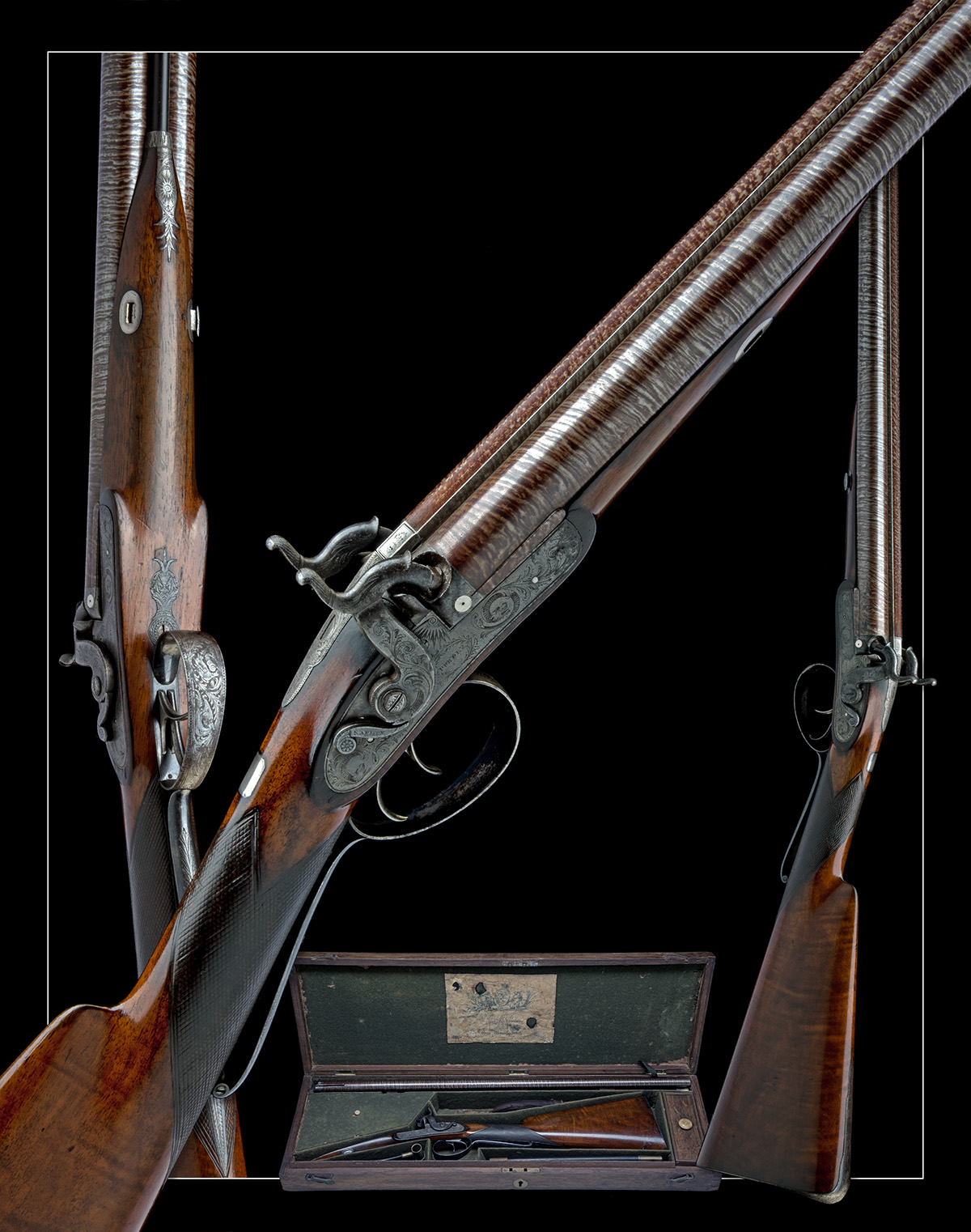 J. PURDEY, LONDON AN EARLY CASED 14-BORE PERCUSSION DOUBLE-BARRELLED SPORTING GUN, serial no. 734,